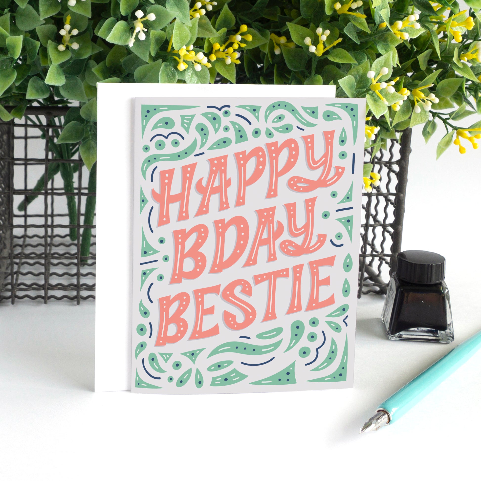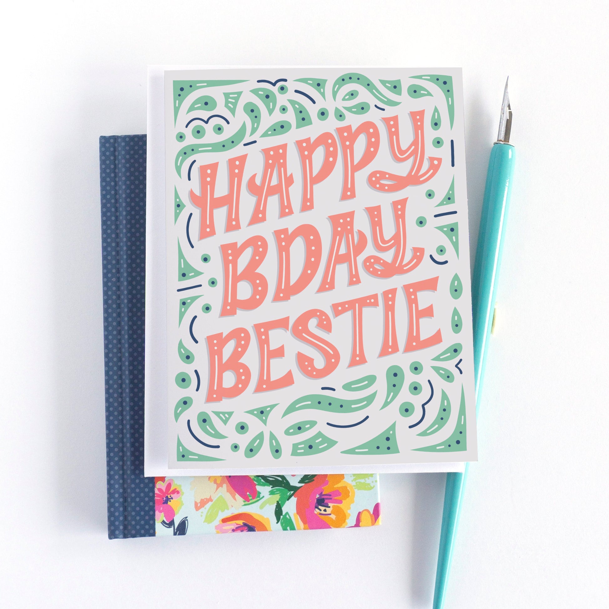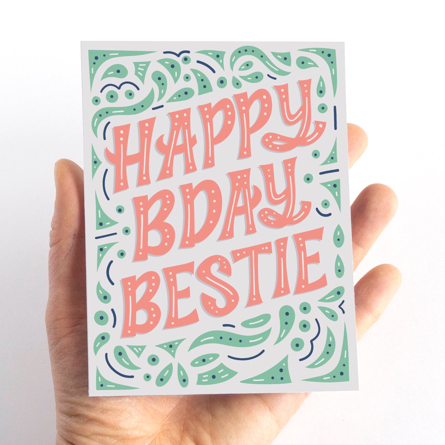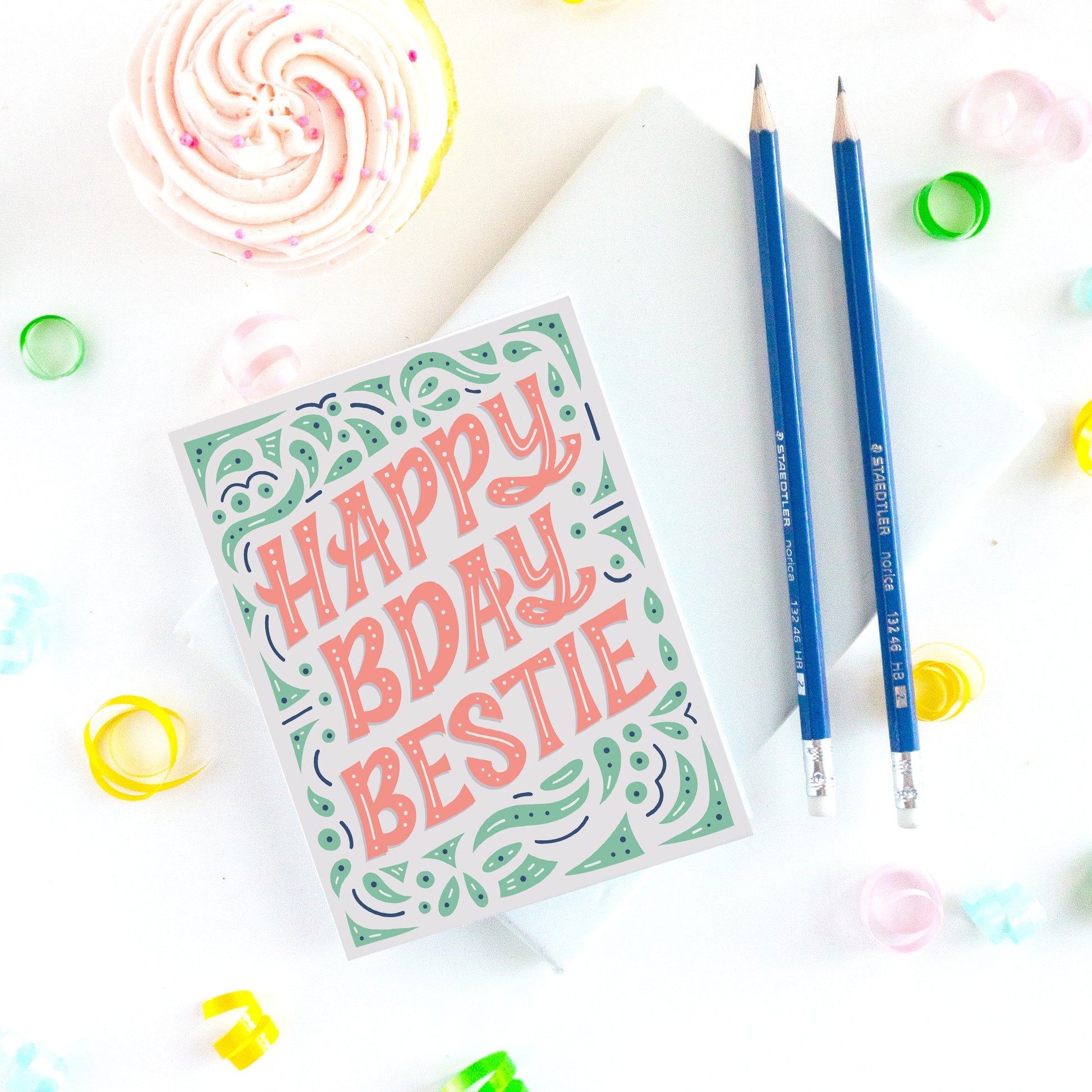 Make their birthday the best day ever with our "Bestie Bday" birthday card! Featuring a hand-lettered message that says "Happy Bday Bestie" surrounded by a intricate border, this card is perfect for sending warm birthday wishes to your best friend. It's a fun and thoughtful way to let them know you're thinking of them on their special day.