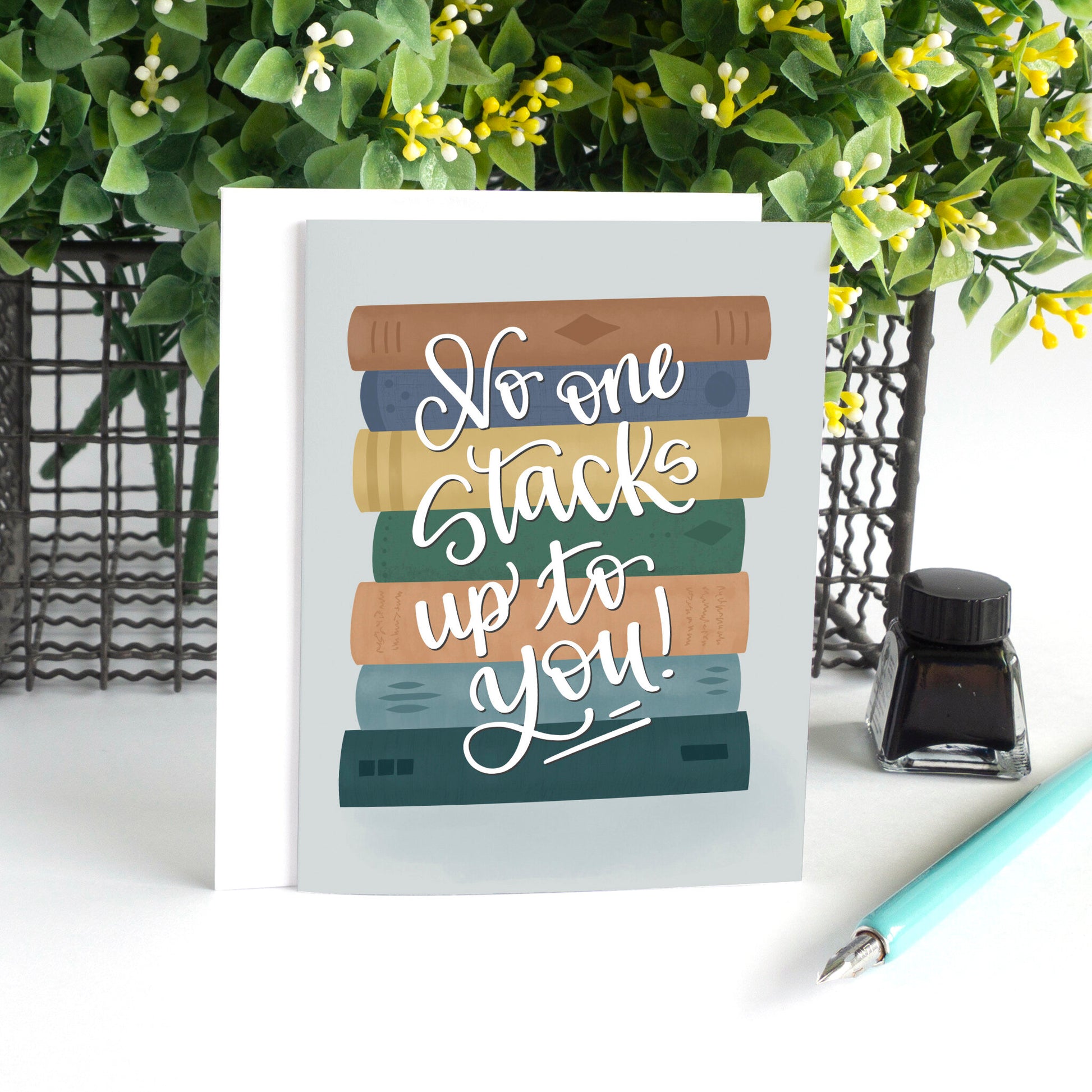 Celebrate your unique love story with our delightful love card adorned with a stack of books. It lovingly conveys that no one else "stacks up" or holds a place as special in your heart as your partner or spouse. Crafted with heartfelt sentiment, this card is perfect for expressing your deep affection to the book lover in your life. Its message captures the essence of your one-of-a-kind connection, where the love for each other is as cherished as the most treasured book in your collection. Embrace this sentiment and share your heartfelt message with our thoughtfully designed card, a tribute to your extraordinary bond.