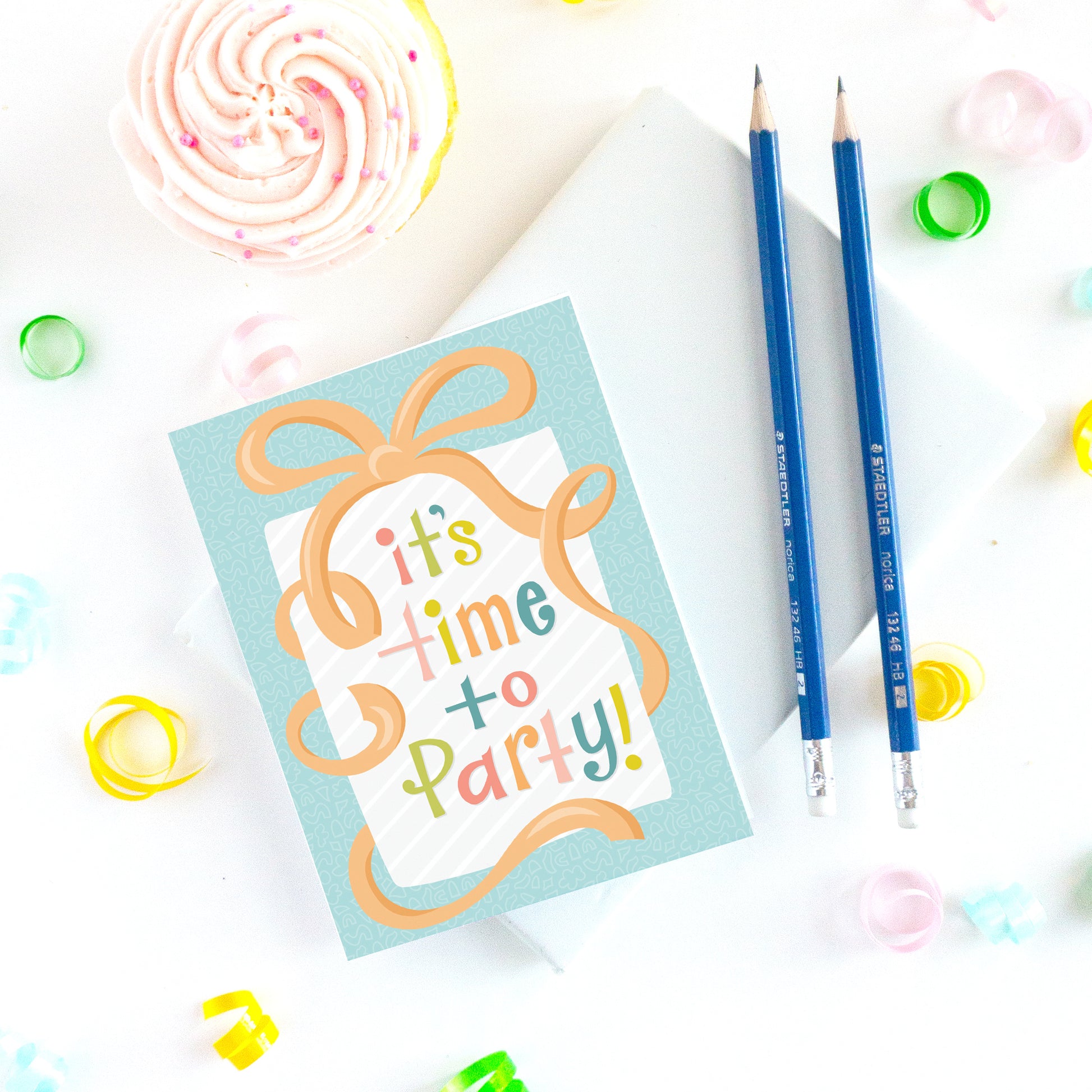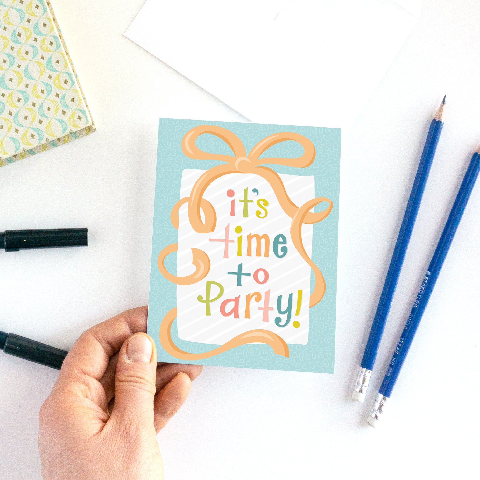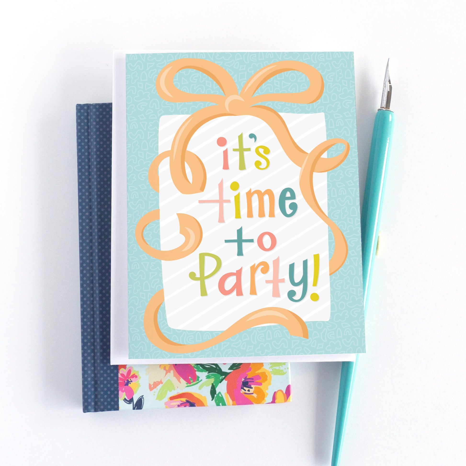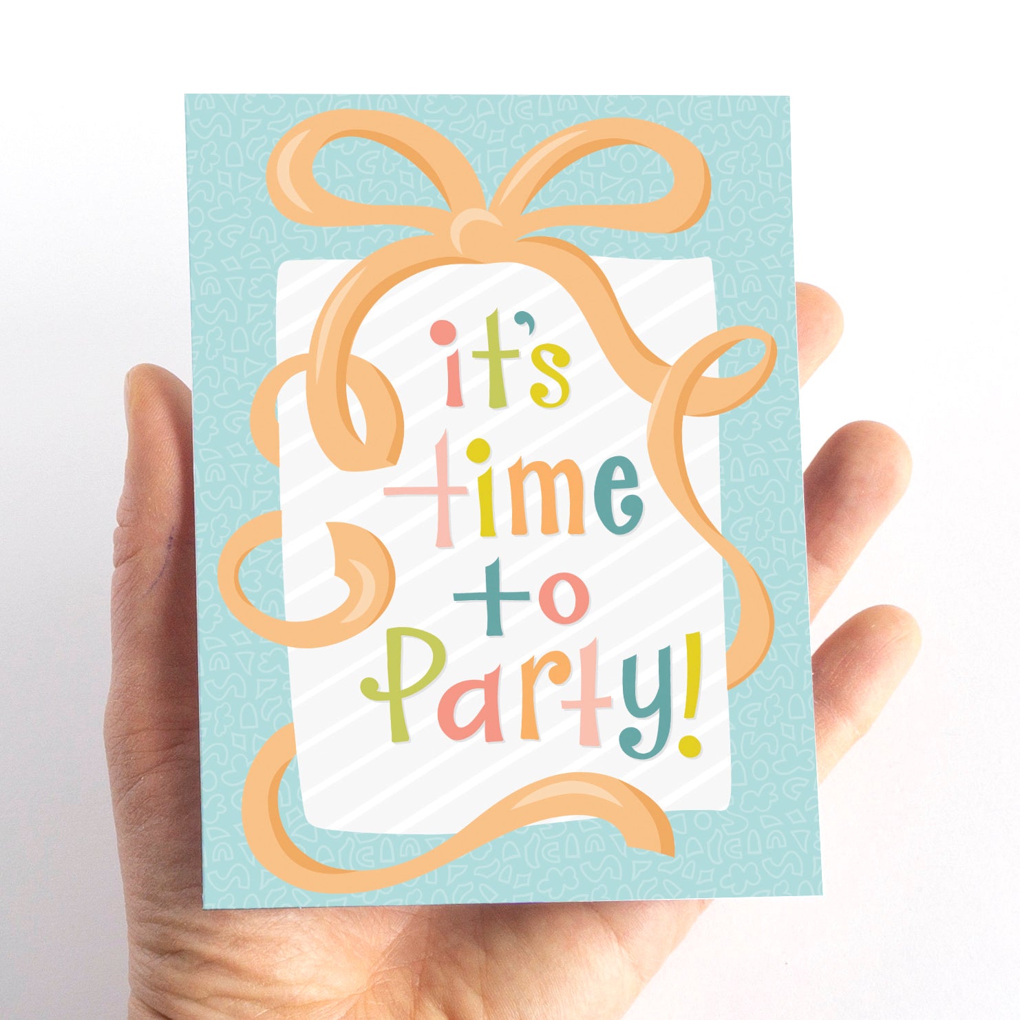 Get the party started with this playful birthday card featuring a hand drawn present wrapped up with a great big bow and colorful “It’s time to party” lettering. Perfect for adding extra cheer to any gift, this card is a fun way to celebrate someone’s special day. Whether tucked into a ribbon-tied package or given on its own, it’s sure to bring a smile and set the tone for a festive celebration.