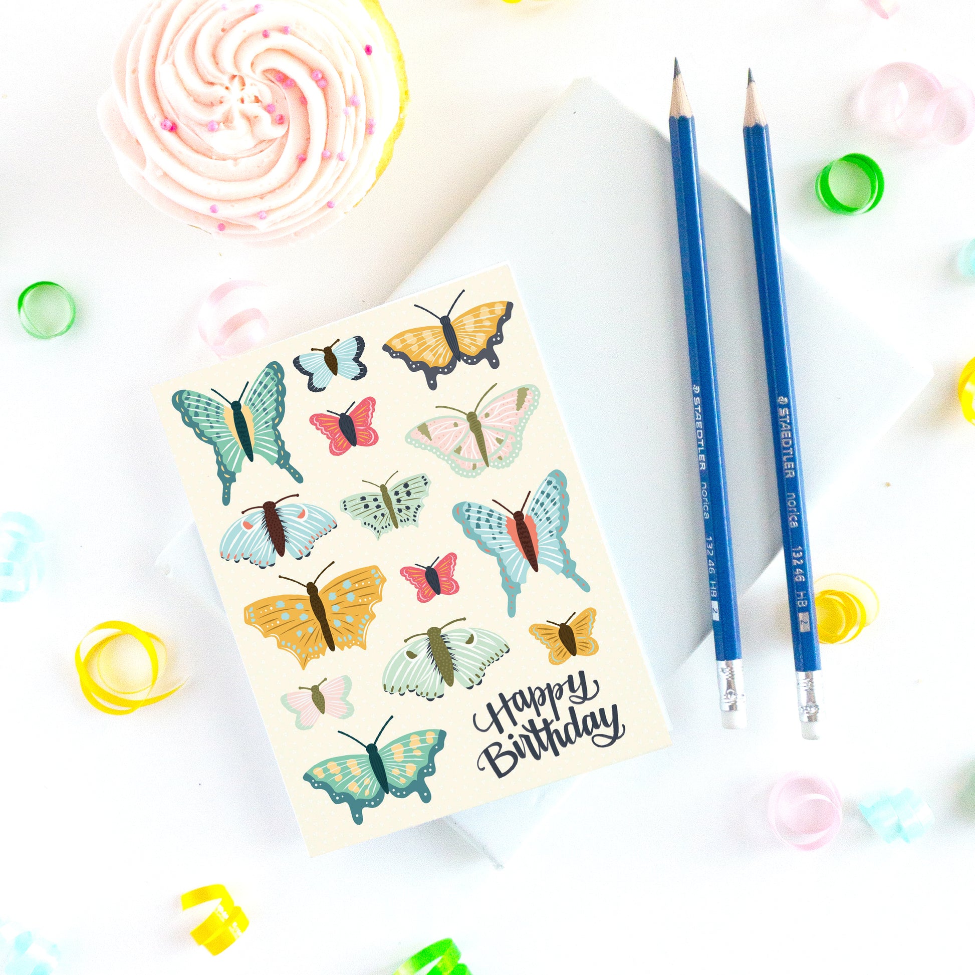 Flutter into birthday joy with our whimsical butterflies birthday card! This playful creation brings the enchantment of nature to your celebration, featuring vibrant illustrations of delicate butterflies. Let the magic of these whimsical butterflies add a touch of joy to the birthday festivities. Perfect for nature lovers or anyone who appreciates the delicate charm of fluttering wings. Make their day extraordinary with a card that captures the playful spirit of butterflies, bringing a burst of natural whimsy to their special celebration!