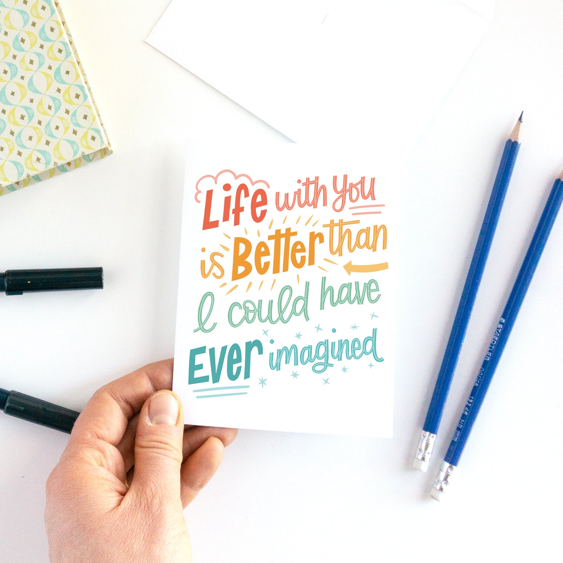 Celebrate love with this hand-drawn, colorful Valentine’s card featuring the heartfelt message, “Life with You is Better Than I Could Have Ever Imagined.” Its vibrant rainbow design symbolizes joy, connection, and a love that stands the test of time. Perfect for Valentine’s Day, anniversaries, or any special moment, it makes a thoughtful and memorable gift. Bright, cheerful, and full of sentiment, this card shows your partner just how much they mean to you, creating a keepsake to treasure.