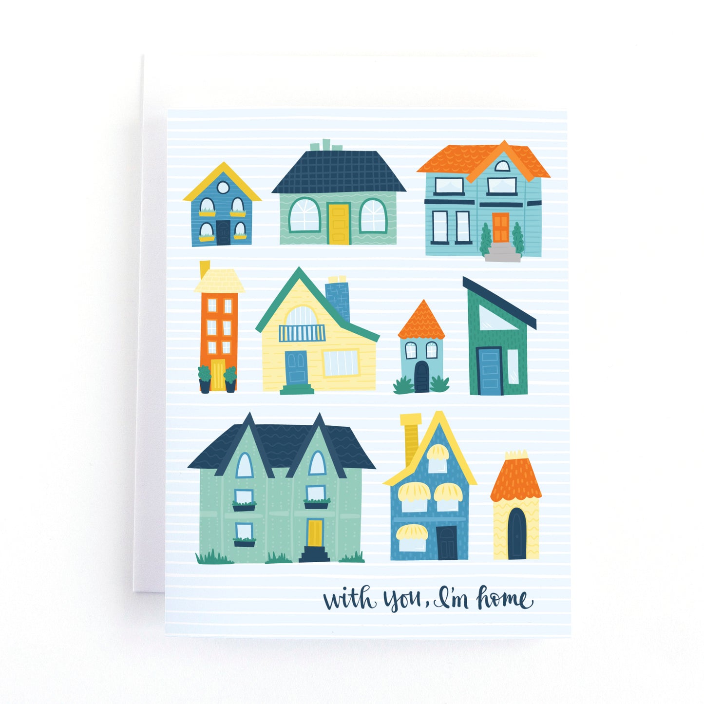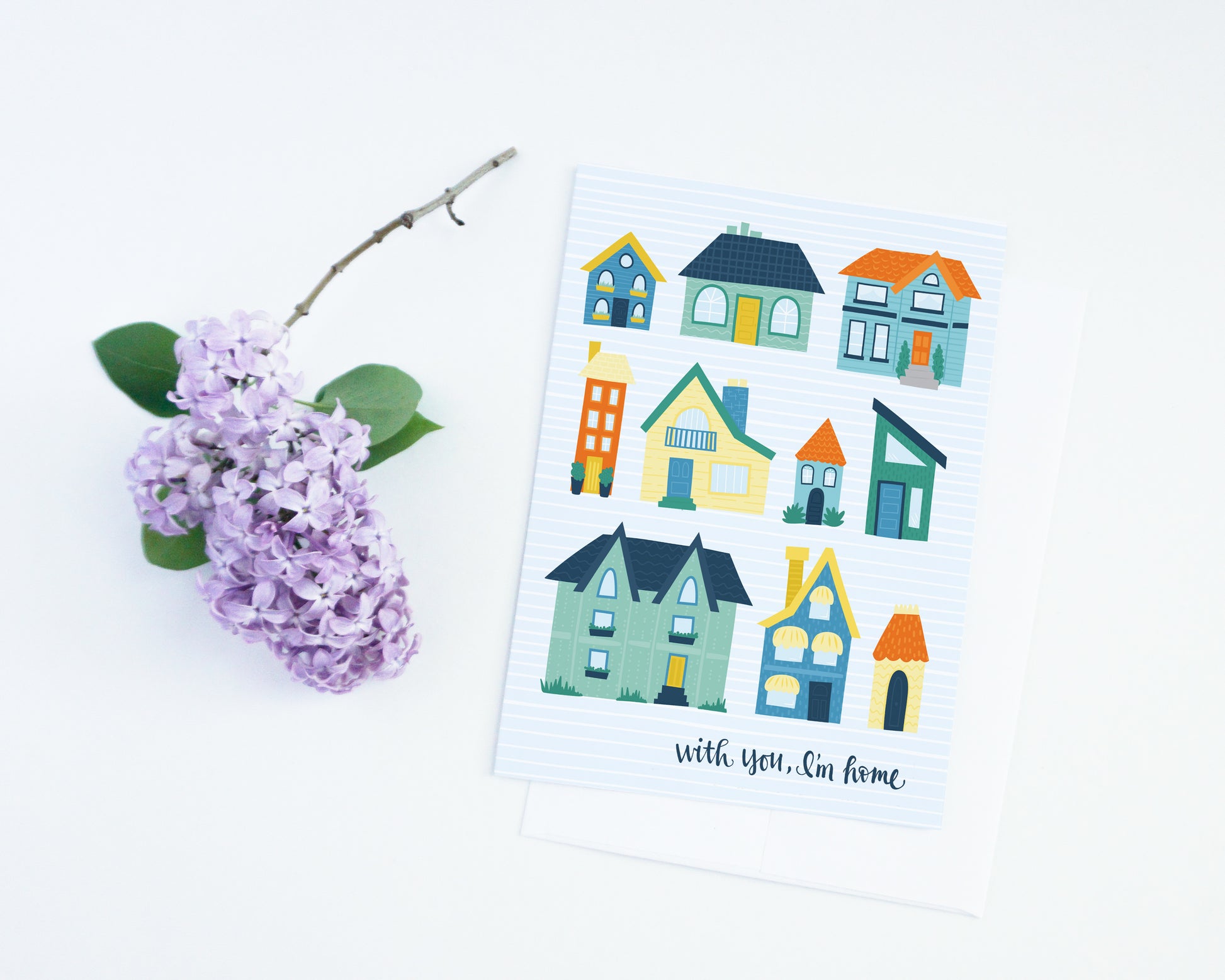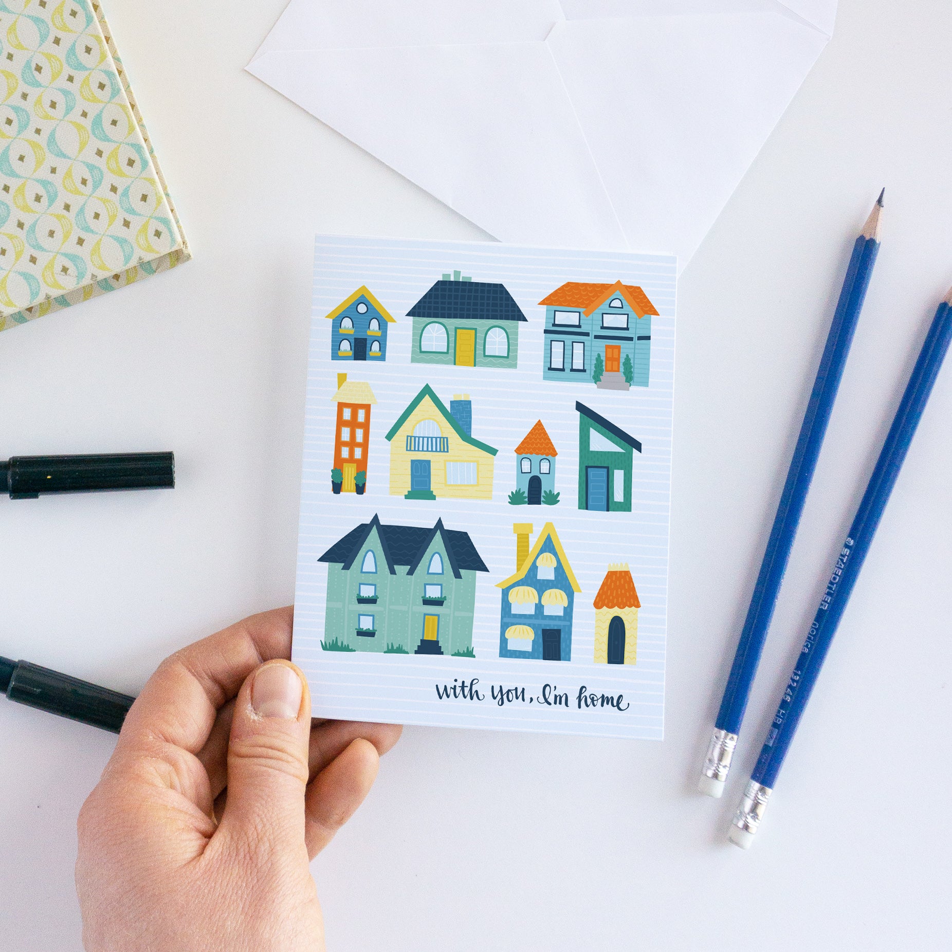 Celebrate the sweet feeling of being home wherever you are with our adorable love card. Illustrated with charming and unique houses, it beautifully conveys the idea that as long as you're together, you're home. Crafted with heartfelt sincerity, this card is perfect for expressing your deep love to your partner or spouse. Its message captures the essence of your bond, where love provides the warmth and comfort of home, no matter where life takes you. Embrace this sentiment and share your heartfelt message with our thoughtfully designed card, a reminder of the enduring love that makes every place feel like home.