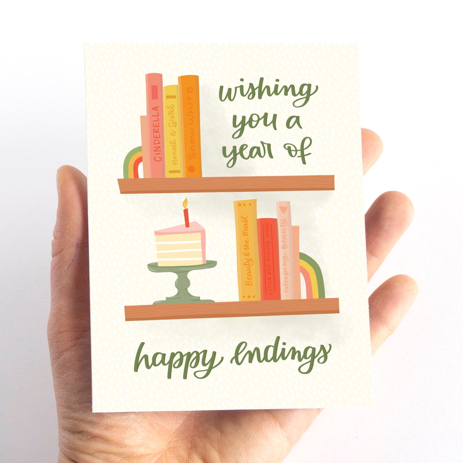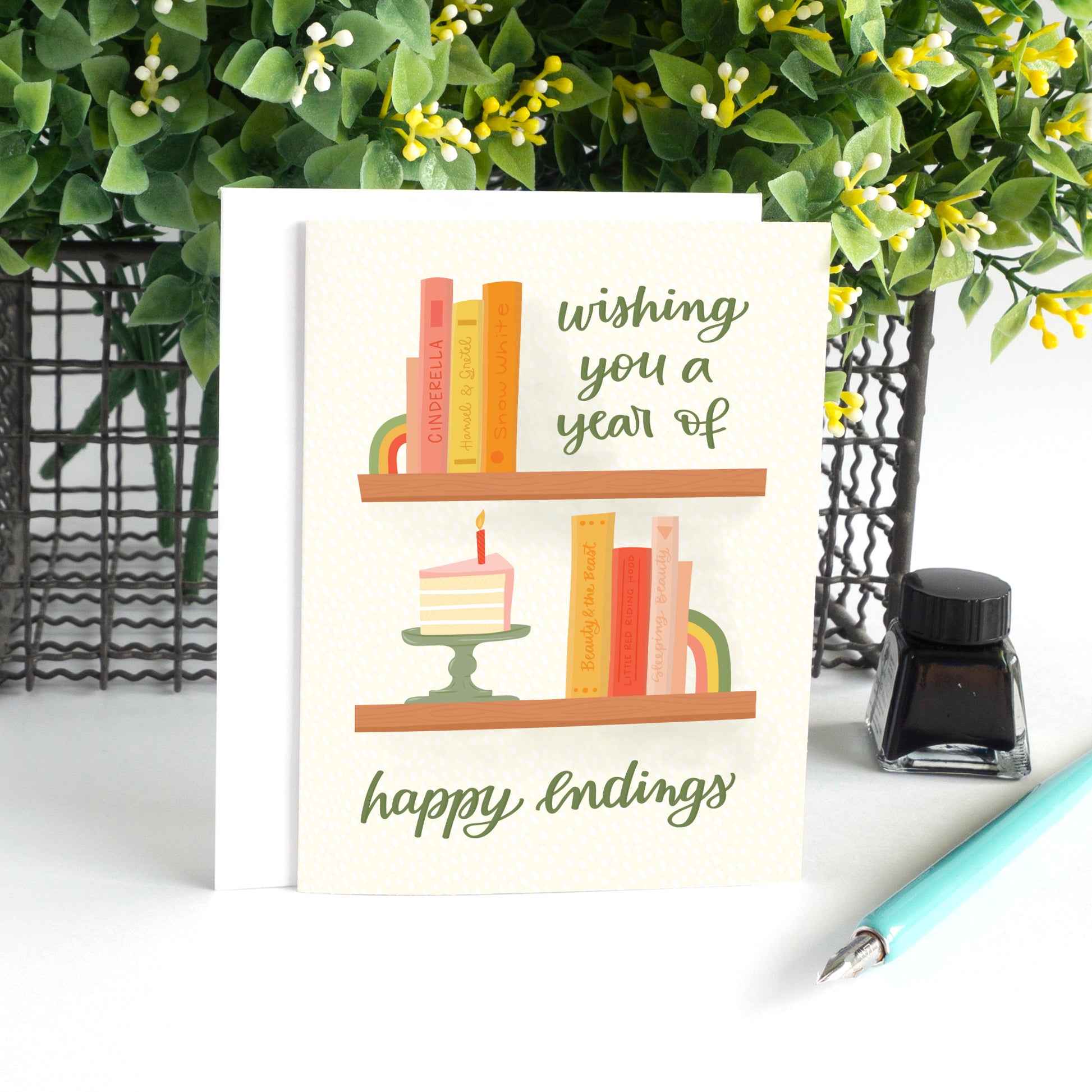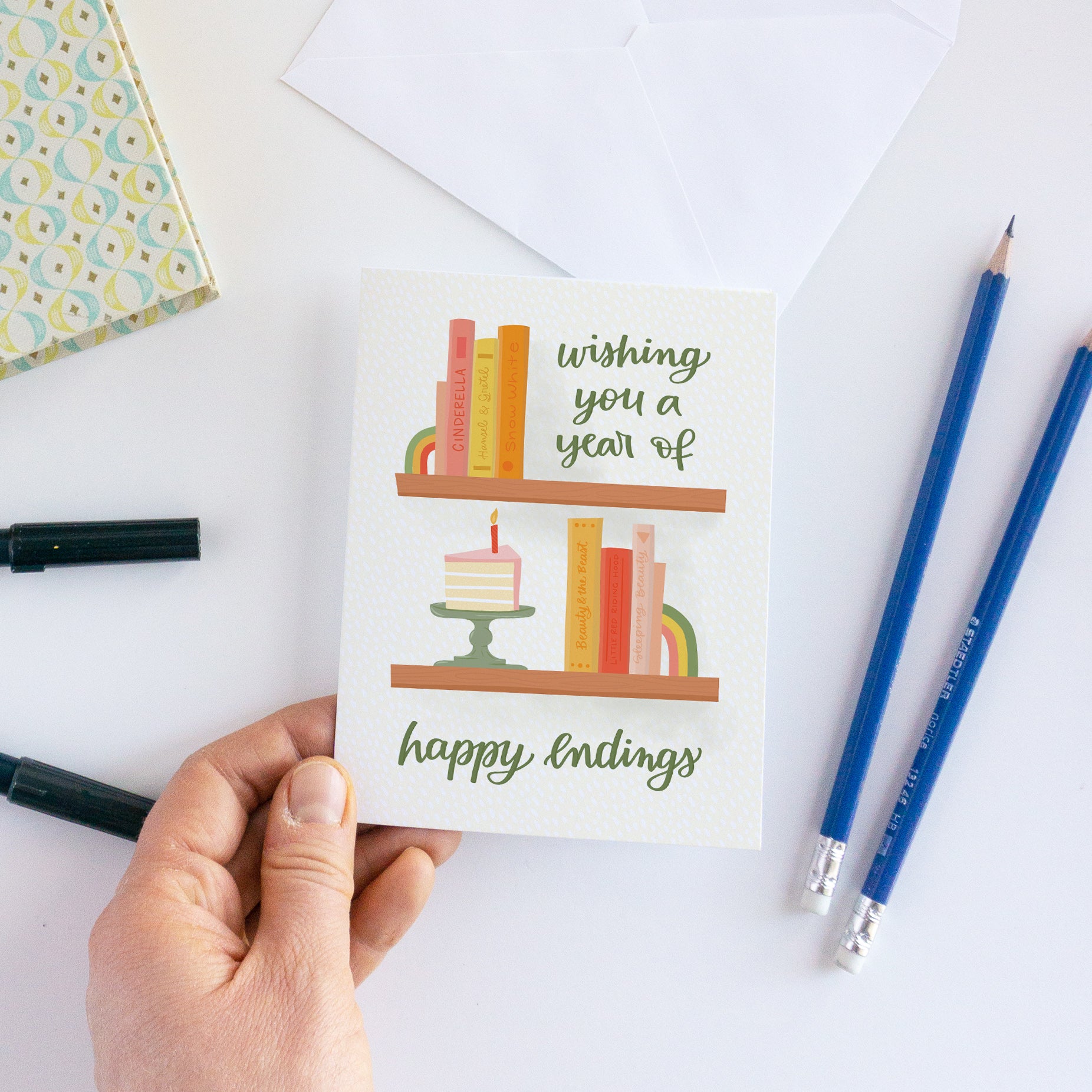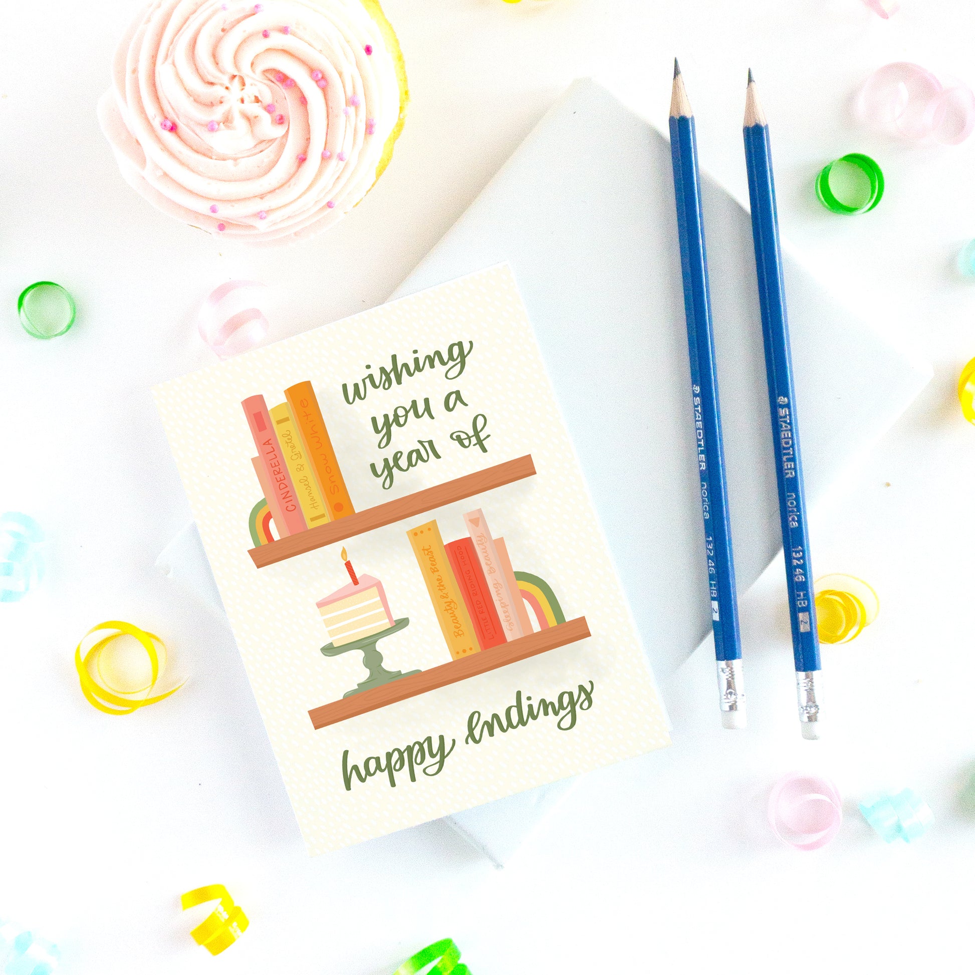 Celebrate the book lover's special day with our enchanting birthday card featuring a cozy bookshelf adorned with a collection of books and a tempting slice of birthday cake. The heartfelt message wishes the recipient a year of happy endings, just like the stories they adore. Perfect for teachers, librarians, and fellow book worms, this card is a delightful way to share smiles and appreciation. Crafted with care, it's an ideal accompaniment to any birthday gift, infusing the day with the magic of literature and warmth. Gift a year of endless stories and happiness with our captivating books birthday card, tailor-made for bibliophiles.