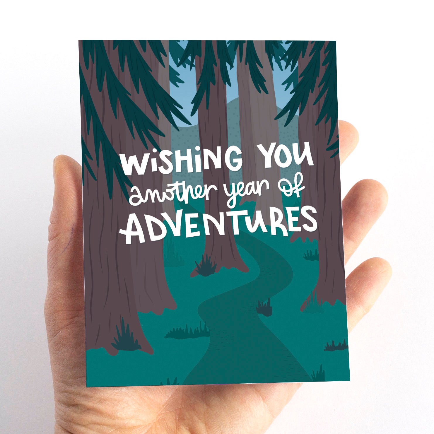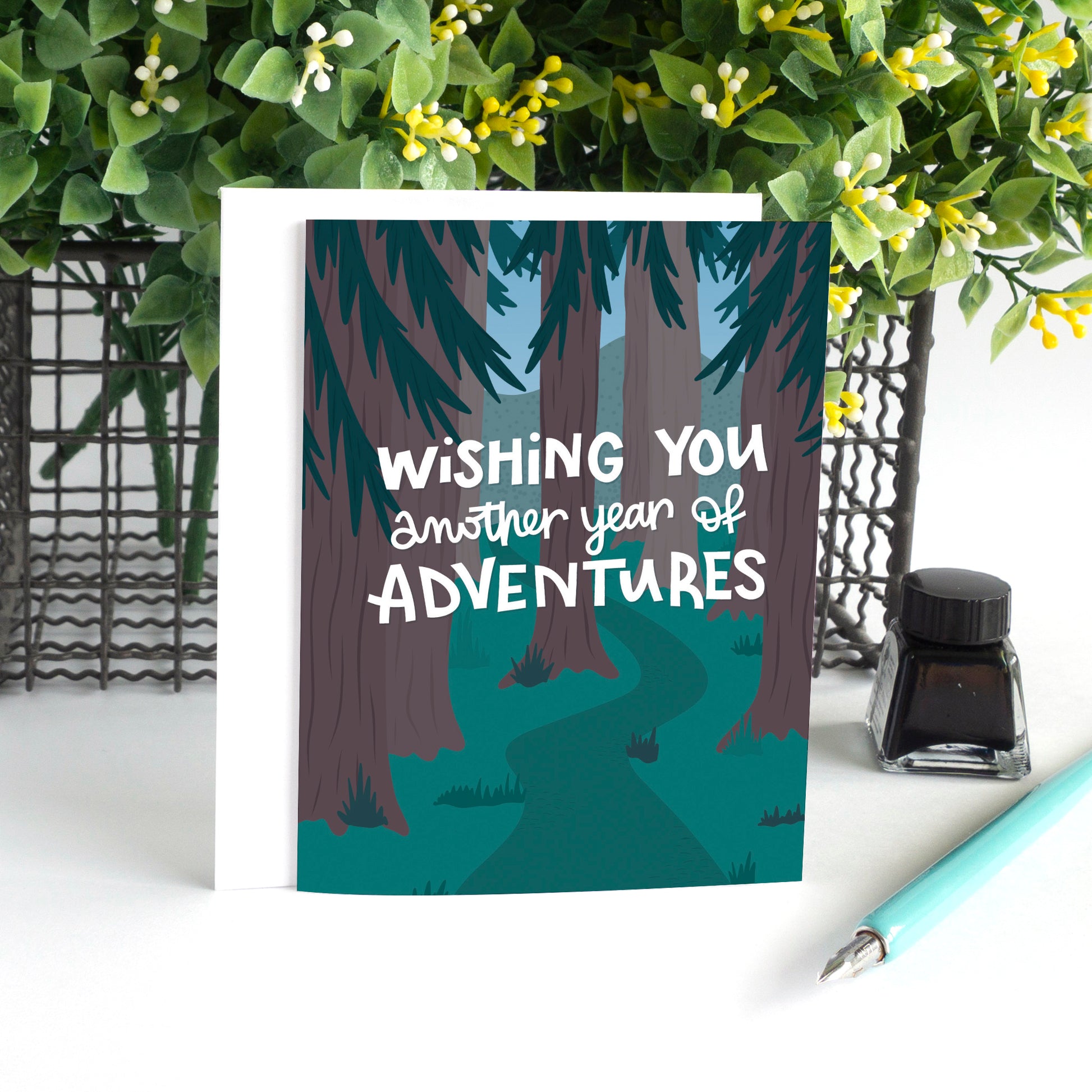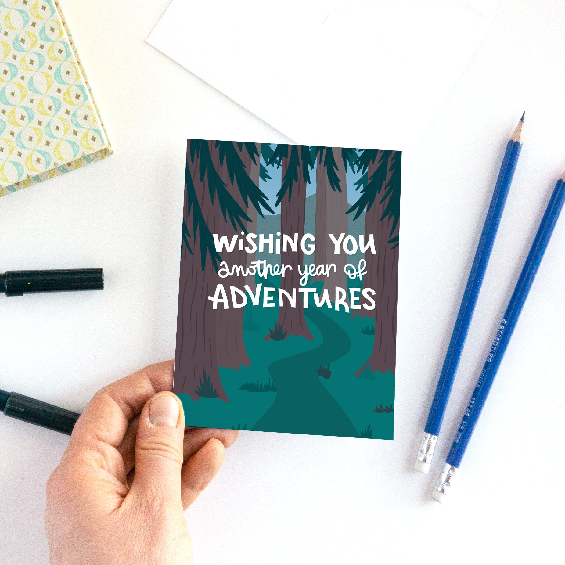 Send birthday wishes with a sense of adventure! This hand drawn hiking-themed card features a scenic trail winding through the woods with the cheerful message “wishing you another year of adventures.” Perfect for mountain lovers, campers, and anyone who feels happiest exploring the great outdoors. It’s a fun and thoughtful addition to any birthday gift, sure to delight those who are always ready to hit the trail and discover what’s around the next bend.