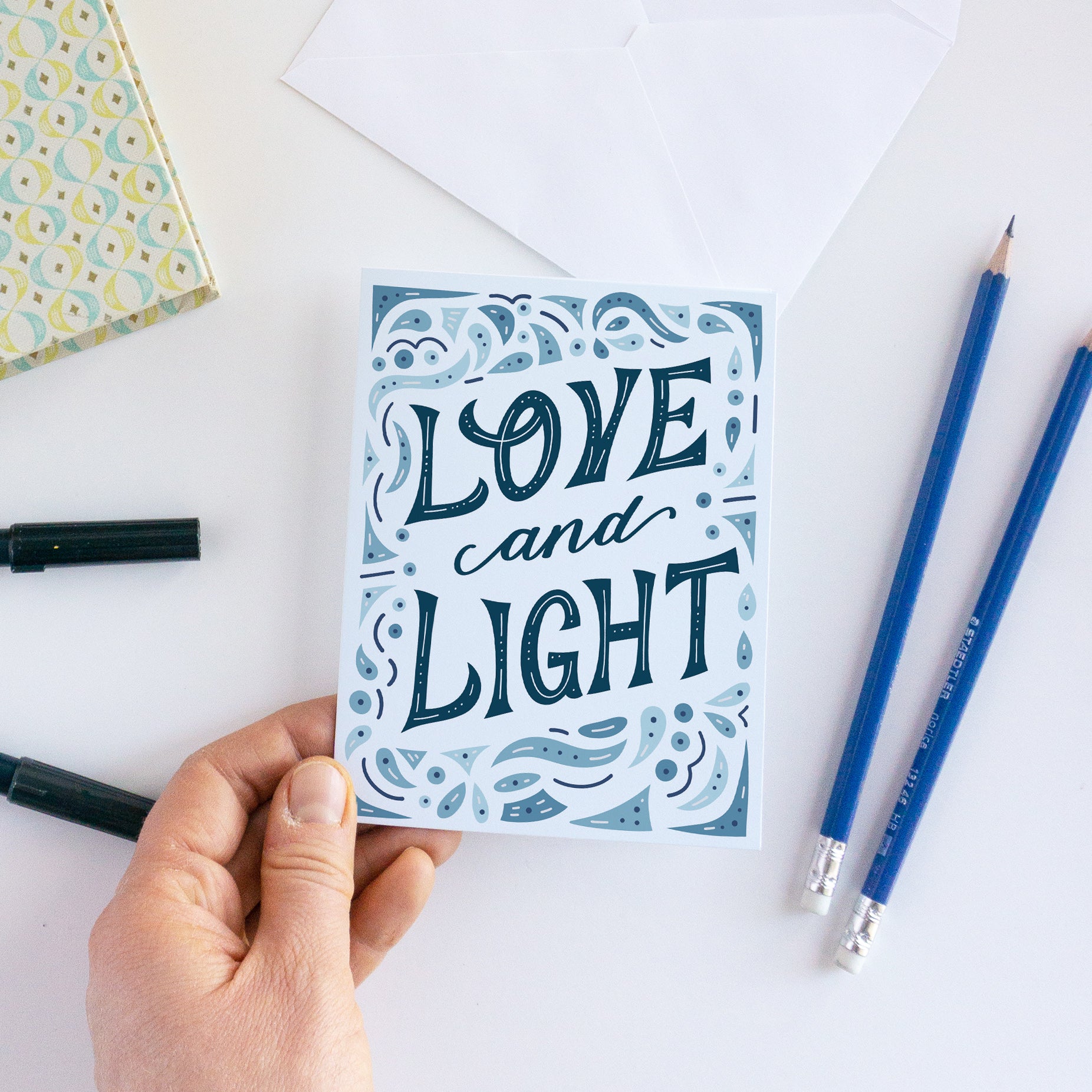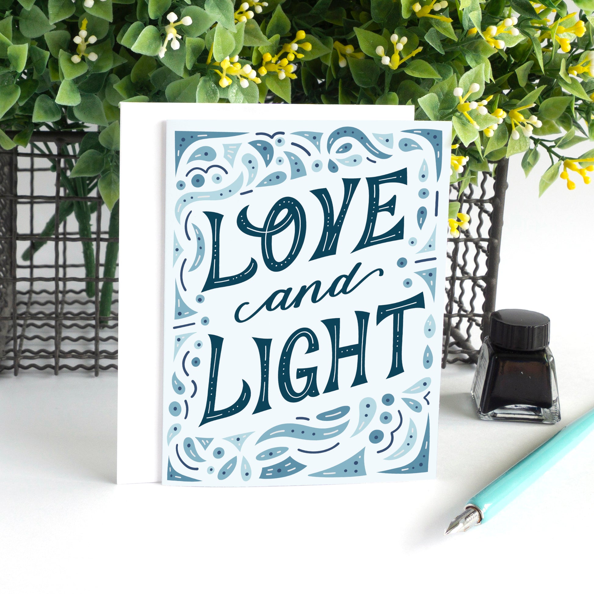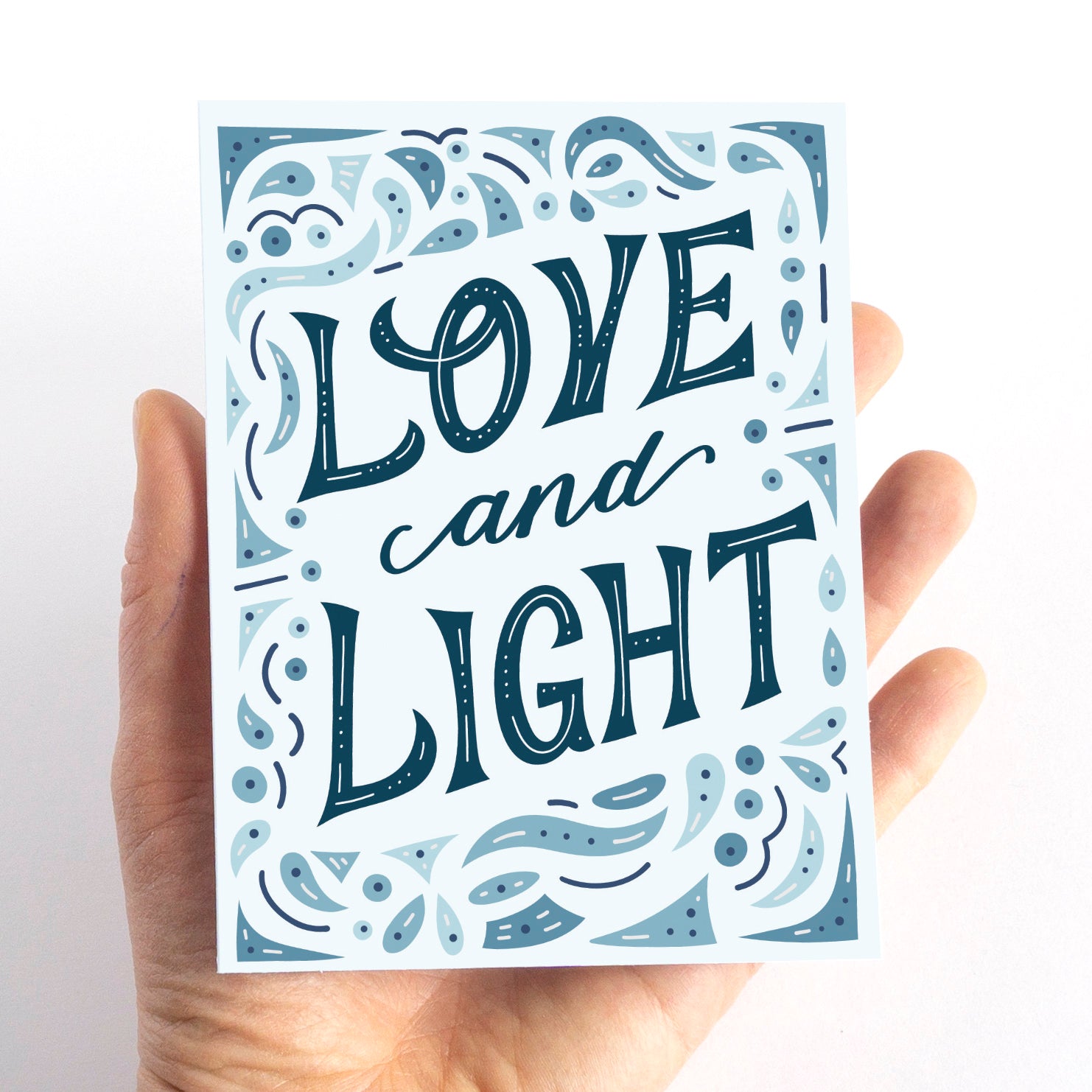 Embrace the beauty of Hanukkah with our stunning holiday card. Designed with modern lettering, it features the heartfelt message "Love and Light" encircled by an intricate filigree border. This card is a perfect way to send warm wishes to loved ones during the holiday season, even when distance keeps us apart. Crafted with meticulous attention, it's a meaningful gift that captures the essence of Hanukkah's joy and unity. Whether shared with family, friends, or colleagues, it fosters a sense of togetherness and love during these special celebrations. Share the holiday spirit with our exquisite Hanukkah card, a cherished gift that radiates warmth and connection.