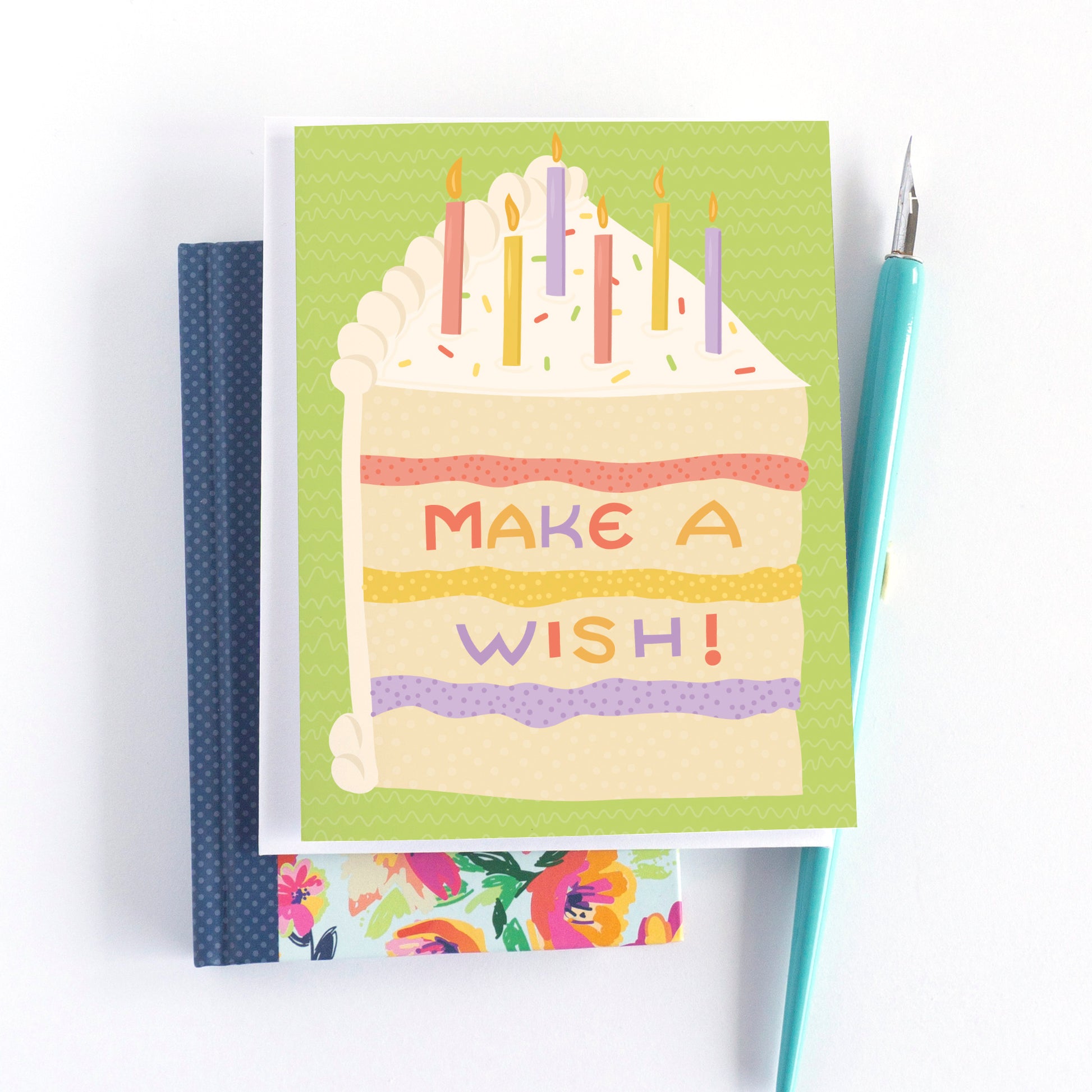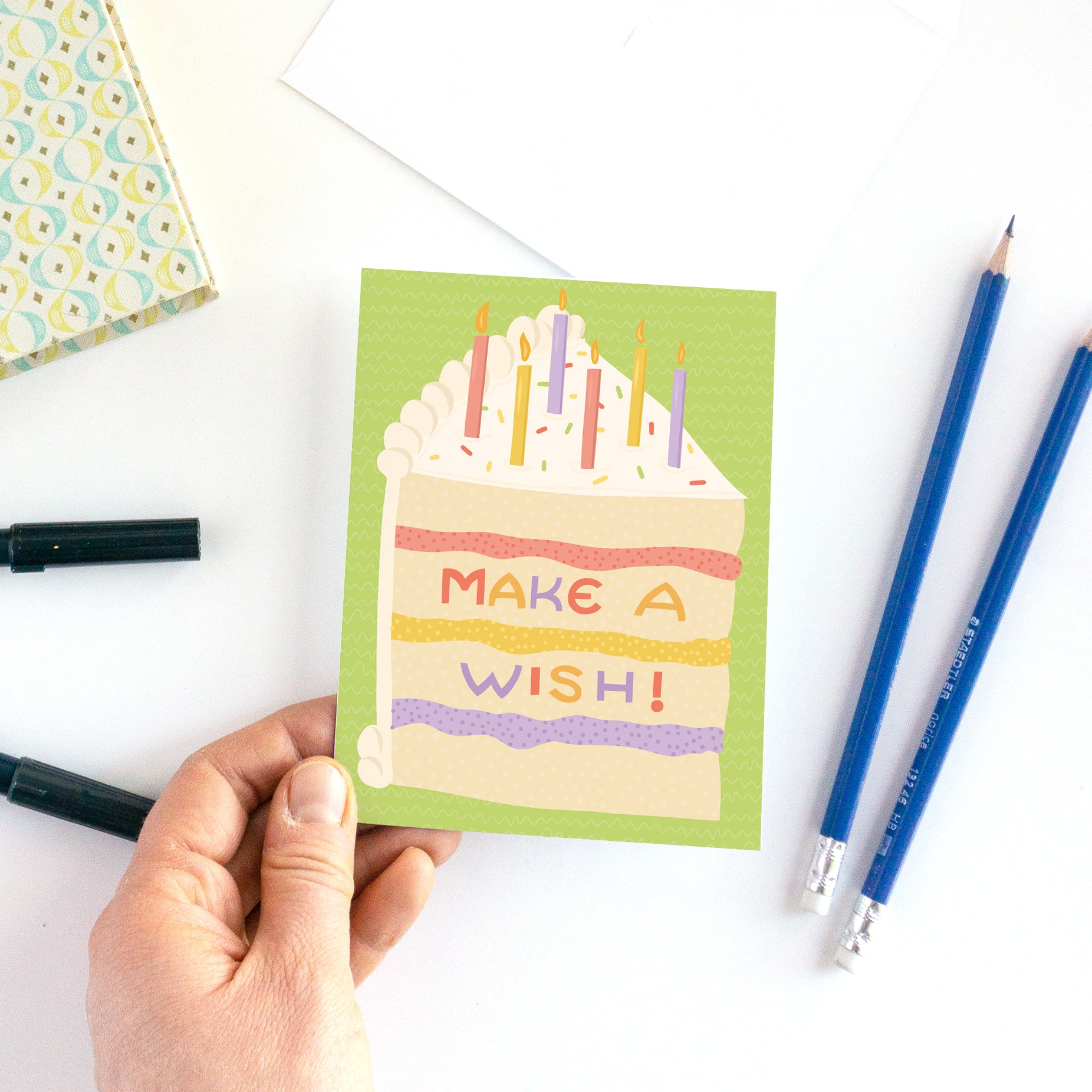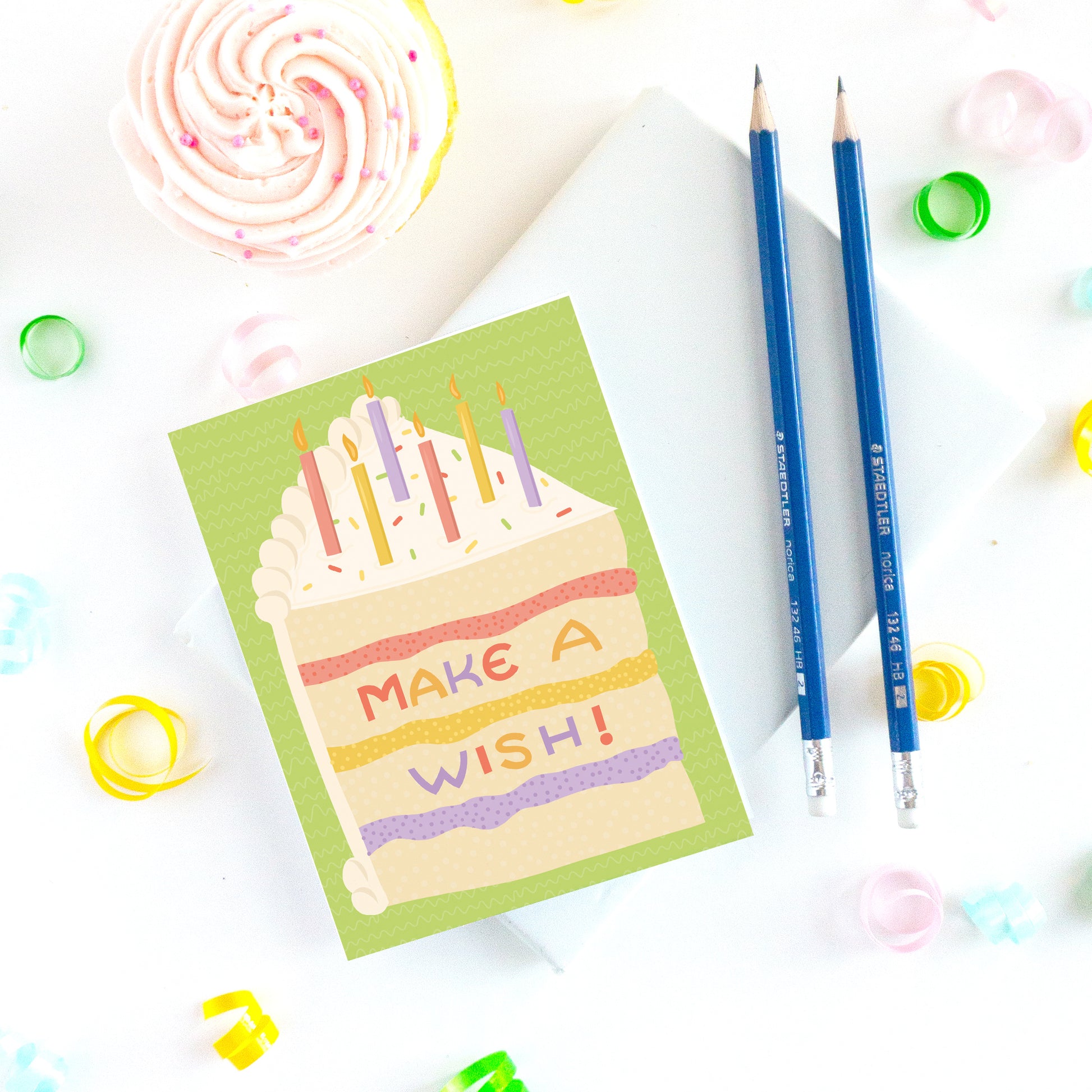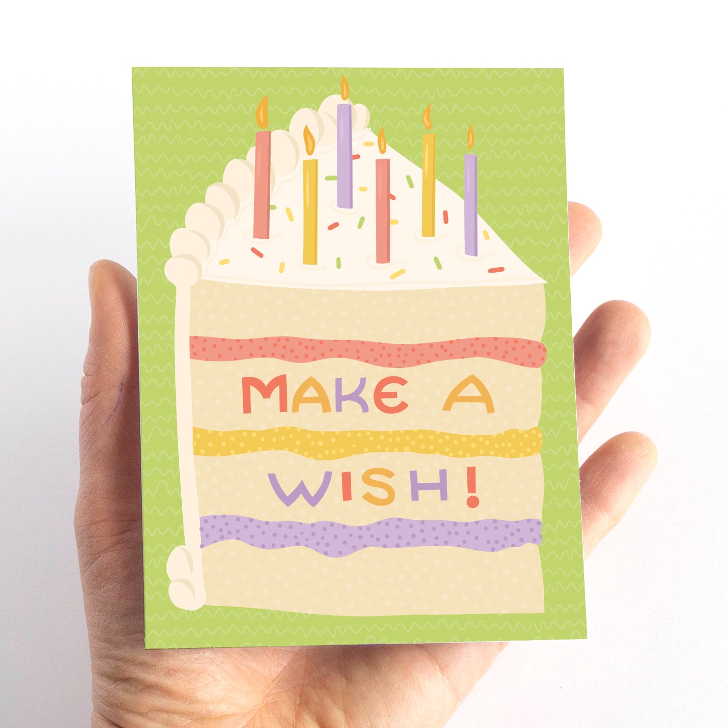 Send a slice of joy with this playful birthday card featuring a hand drawn illustration of a colorful piece of cake topped with candles and the cheerful message, "Make a wish." Perfect for anyone who loves a sweet treat, this card adds a fun and festive touch to any gift. It’s a delightful way to help them indulge in birthday wishes and celebrate their special day in style. A great pick for cake lovers and party enthusiasts alike!