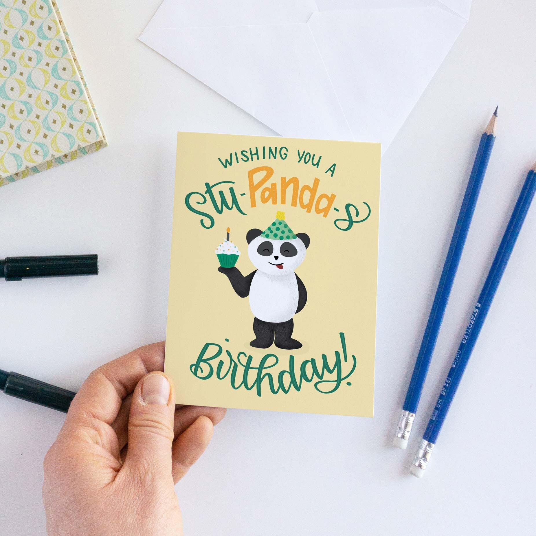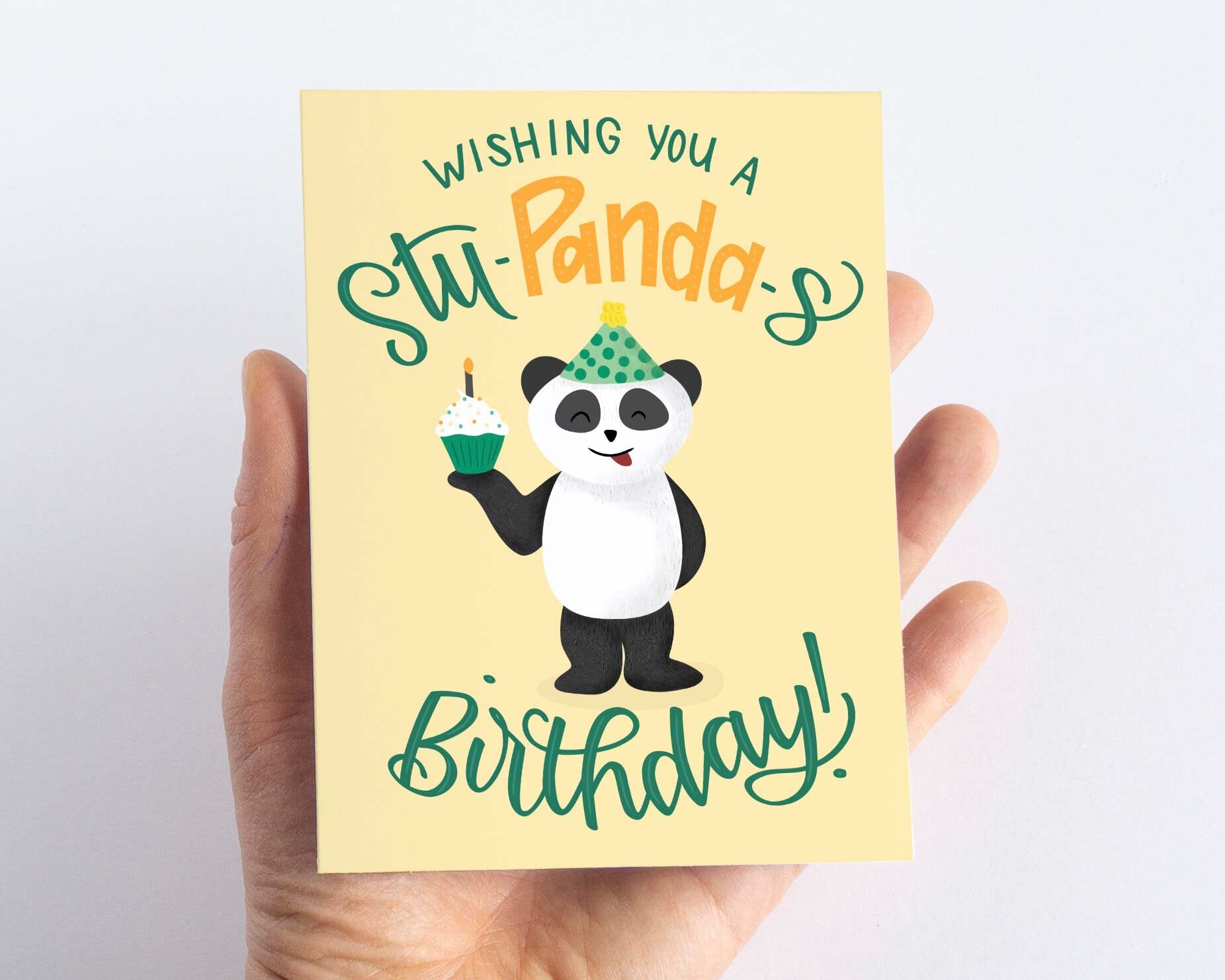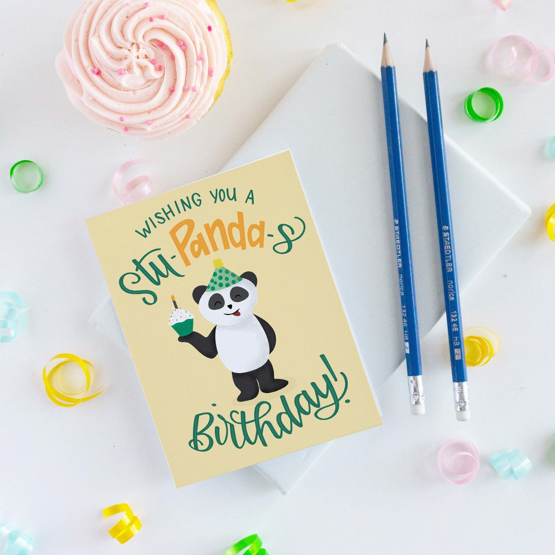 Get the party started with our adorable kids' birthday card! Showcasing an endearing panda all set to celebrate, this card brings a playful charm to the festivities. With a clever play on words, the greeting adds a dose of fun and humor, sure to make them giggle. Crafted with care, this card is a perfect addition to any birthday gift or party. Whether for a friend, sibling, or classmate, our cute and lively design sets the tone for a joyful celebration. Share the laughter and joy of a Stu-Panda-s party with our delightful and pun-filled birthday card!