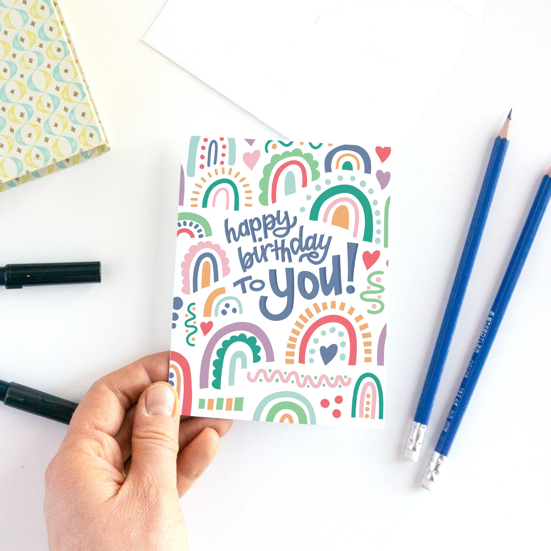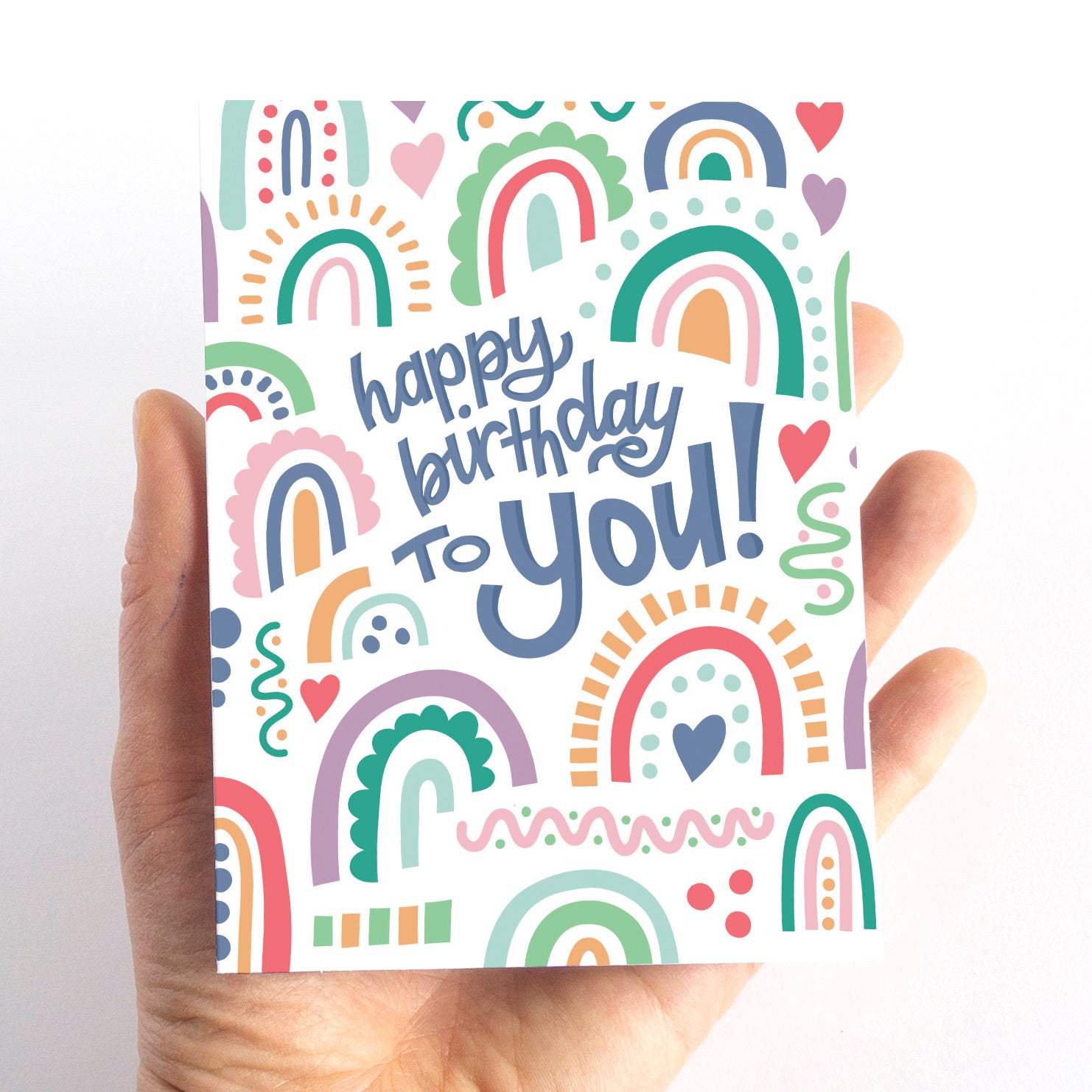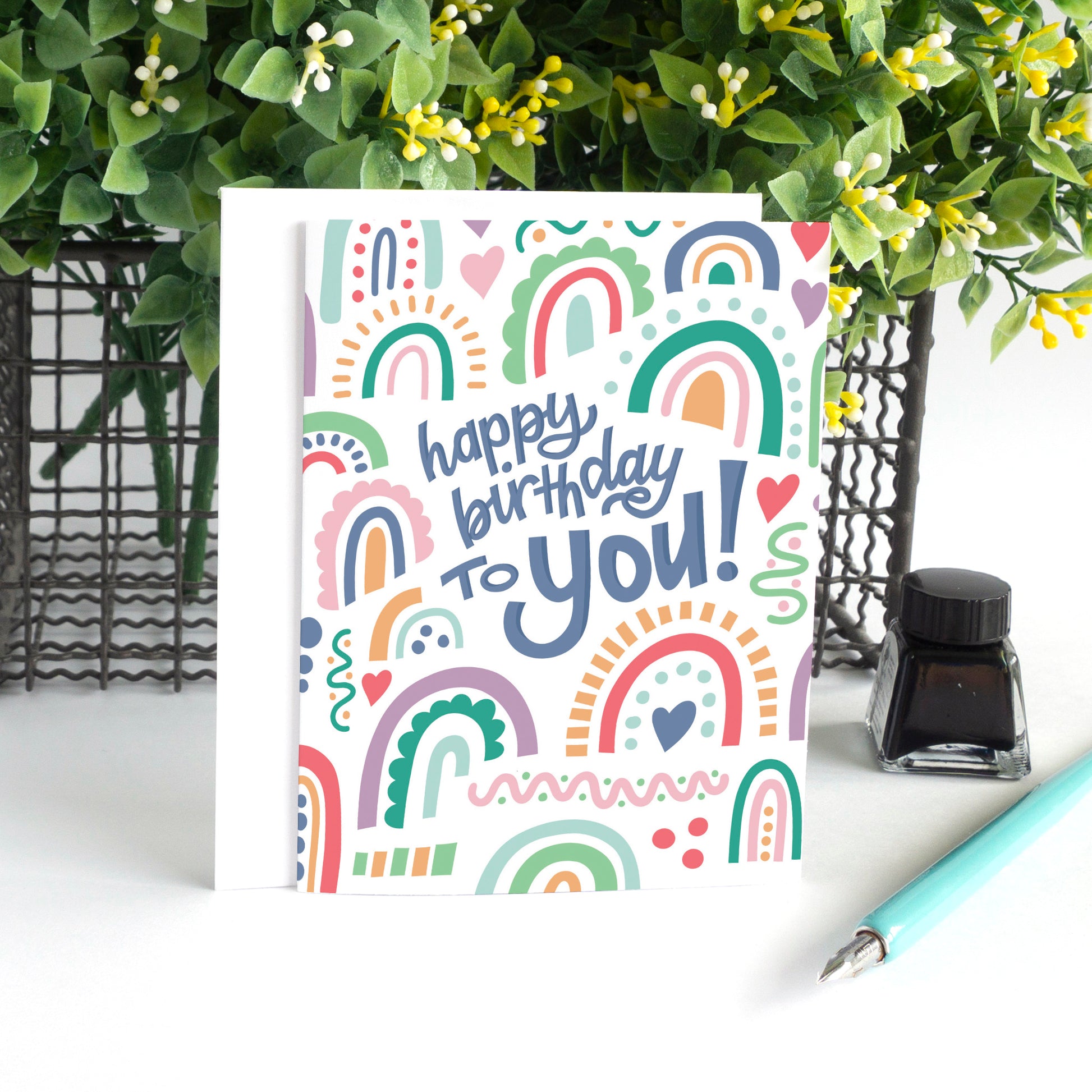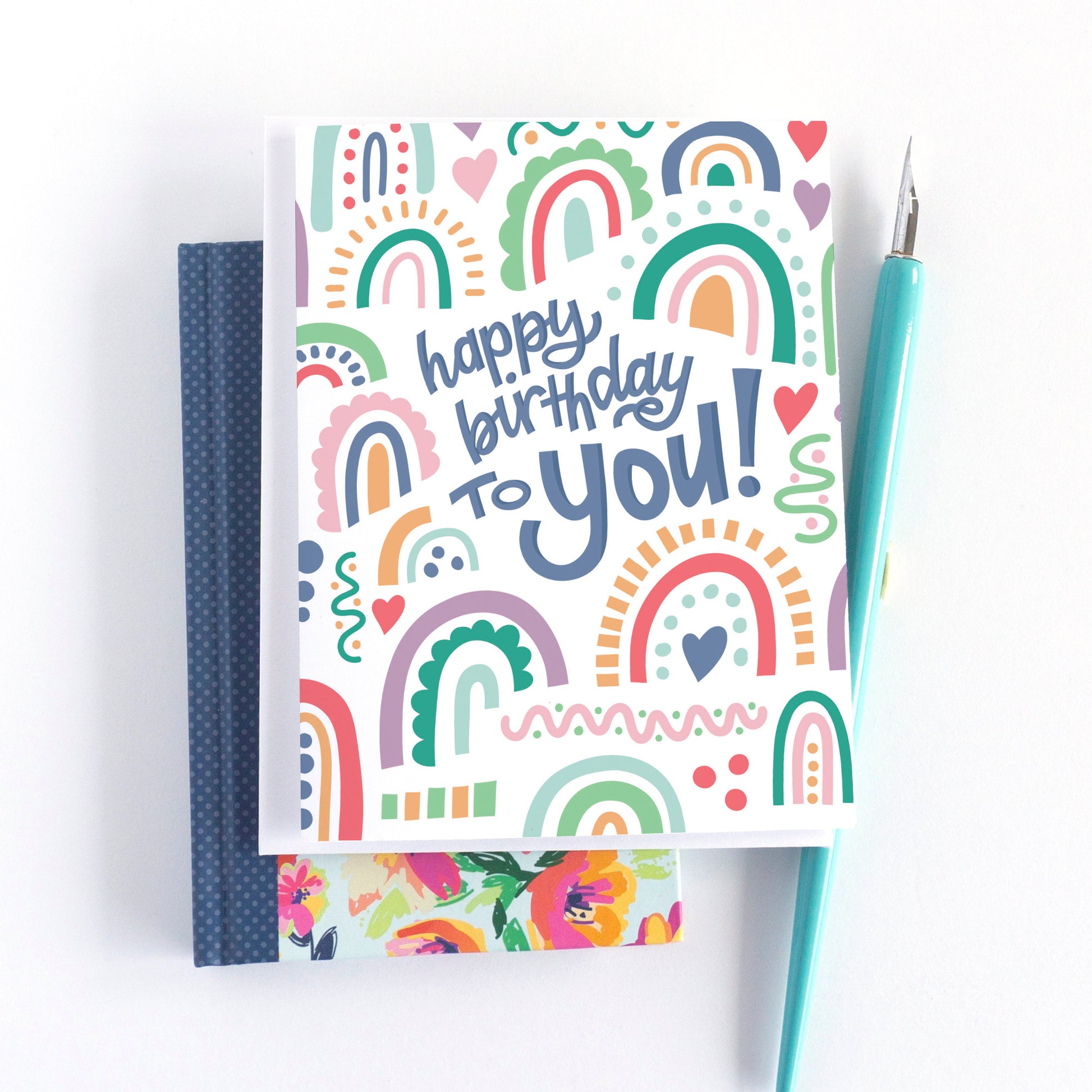 Brighten her special day with this cheerful birthday card featuring hand drawn rainbows and colorful “happy birthday!” lettering. Bursting with whimsy and charm, it’s the perfect way to add a splash of joy to any gift for her. Whether you’re celebrating a friend, family member, or coworker, this playful birthday card is sure to make her smile. A fun and thoughtful addition that shows you care and brings a little extra color to their big day.