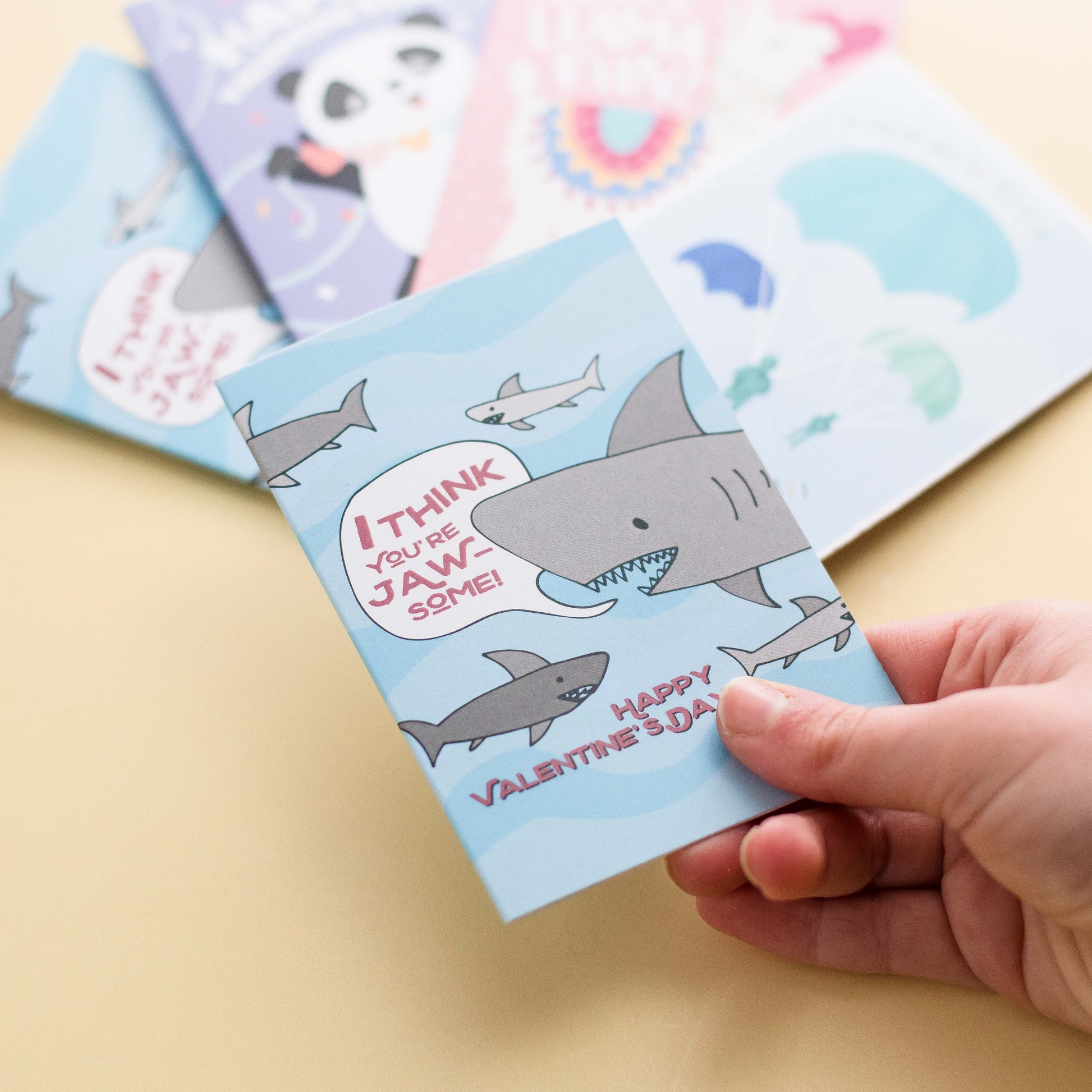 Make a splash this Valentine's Day with our Children's Mini Valentine Set, featuring adorable shark illustrations and puns that will have your little one's classmates grinning from ear to fin! With six mini valentine cards and matching stickers, this set is a fintastic way for your child to express their affection to their school friends. Dive into the ocean of friendship, where the under-the-sea charm of these valentines is sure to make a splash. Celebrate Valentine's Day with a touch of humor and creativity, bringing smiles to every little face in the classroom. It's a jaw-some way to foster friendships!