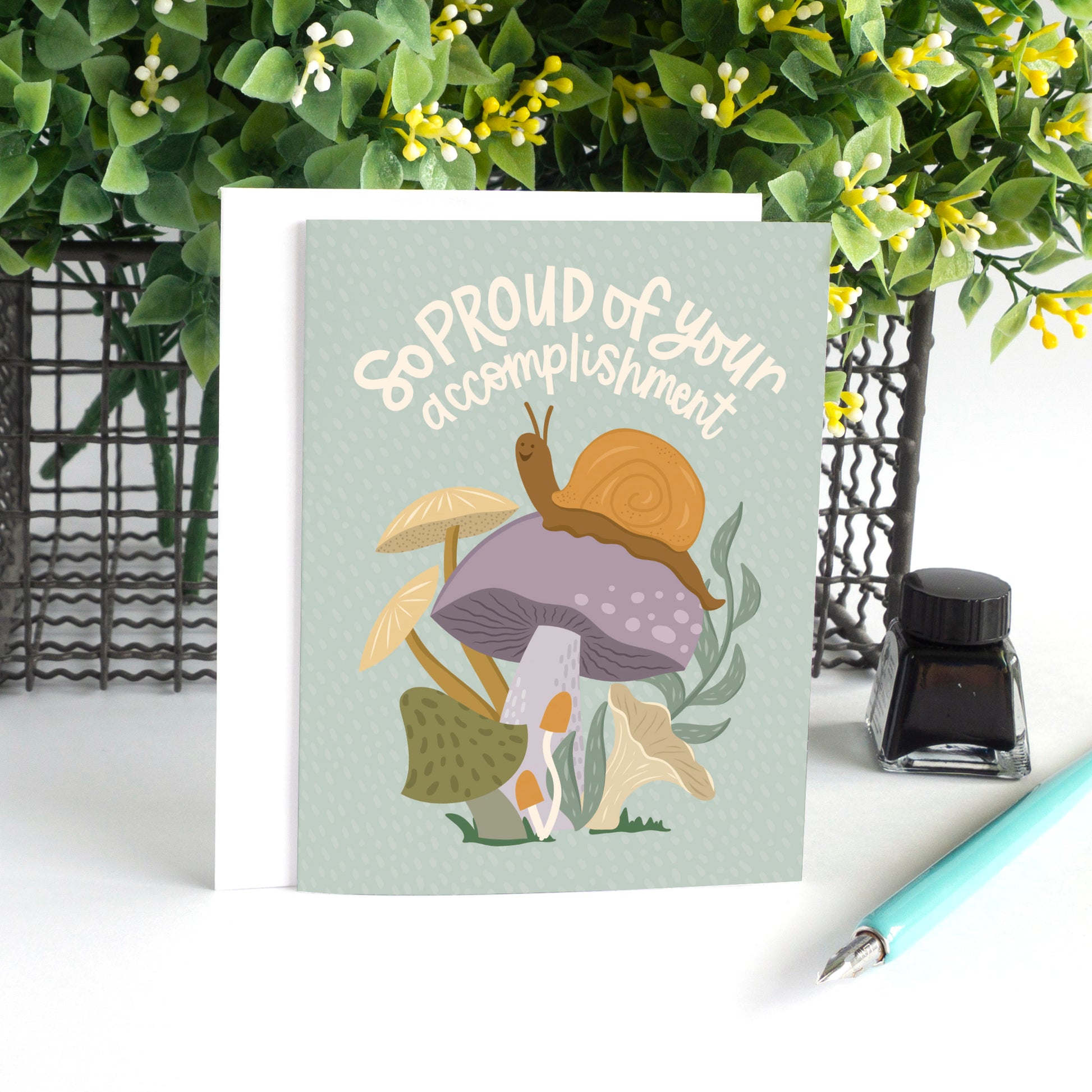 Celebrate a new grad with this charming graduation card featuring a snail climbing a giant mushroom and the encouraging message, “So Proud of Your Accomplishment.” Inspired by nature, it’s a playful reminder that slow and steady climbs still lead to big achievements. Perfect for graduates of all ages, this thoughtful card adds warmth and personality to their milestone, celebrating perseverance, growth, and the journey it took to reach this moment.