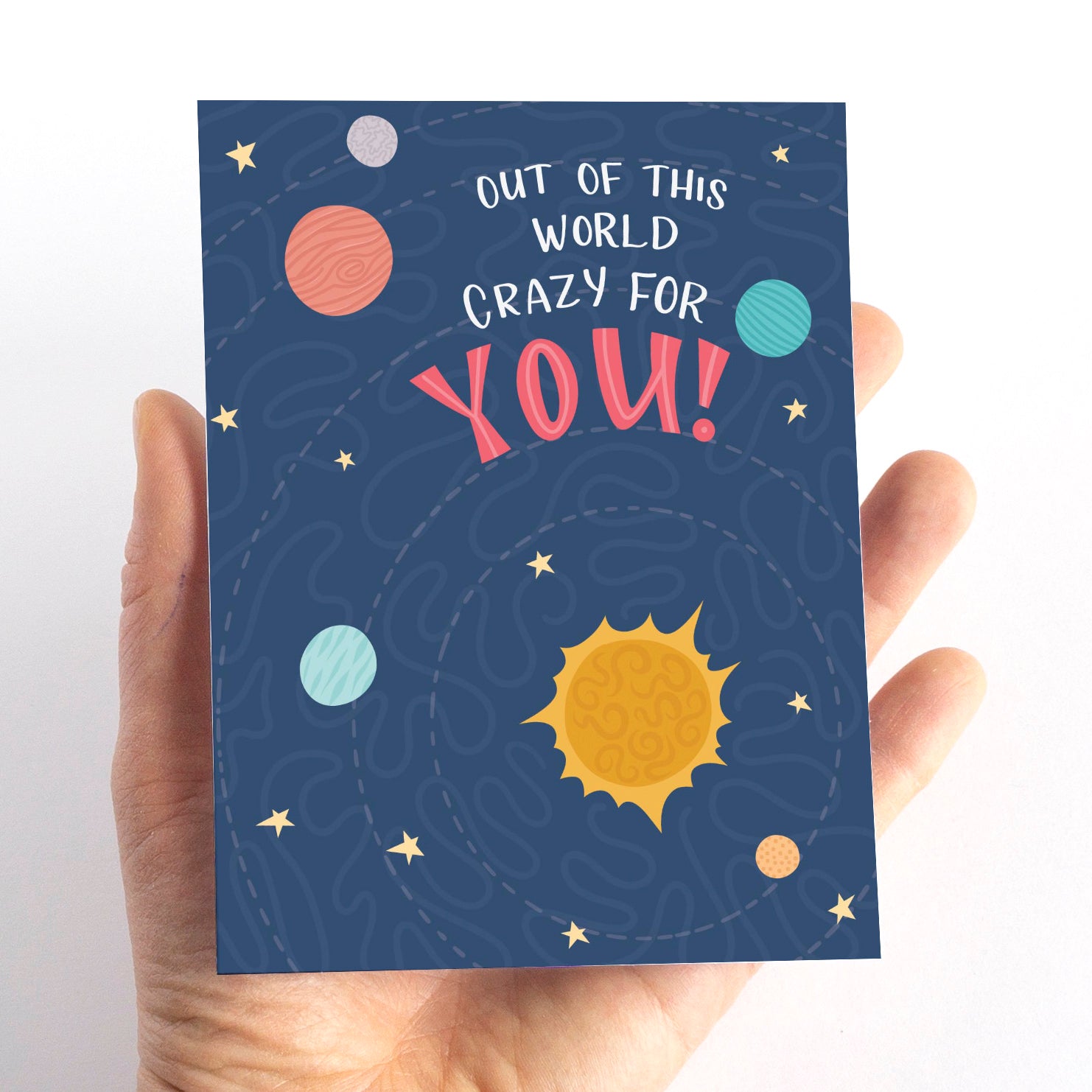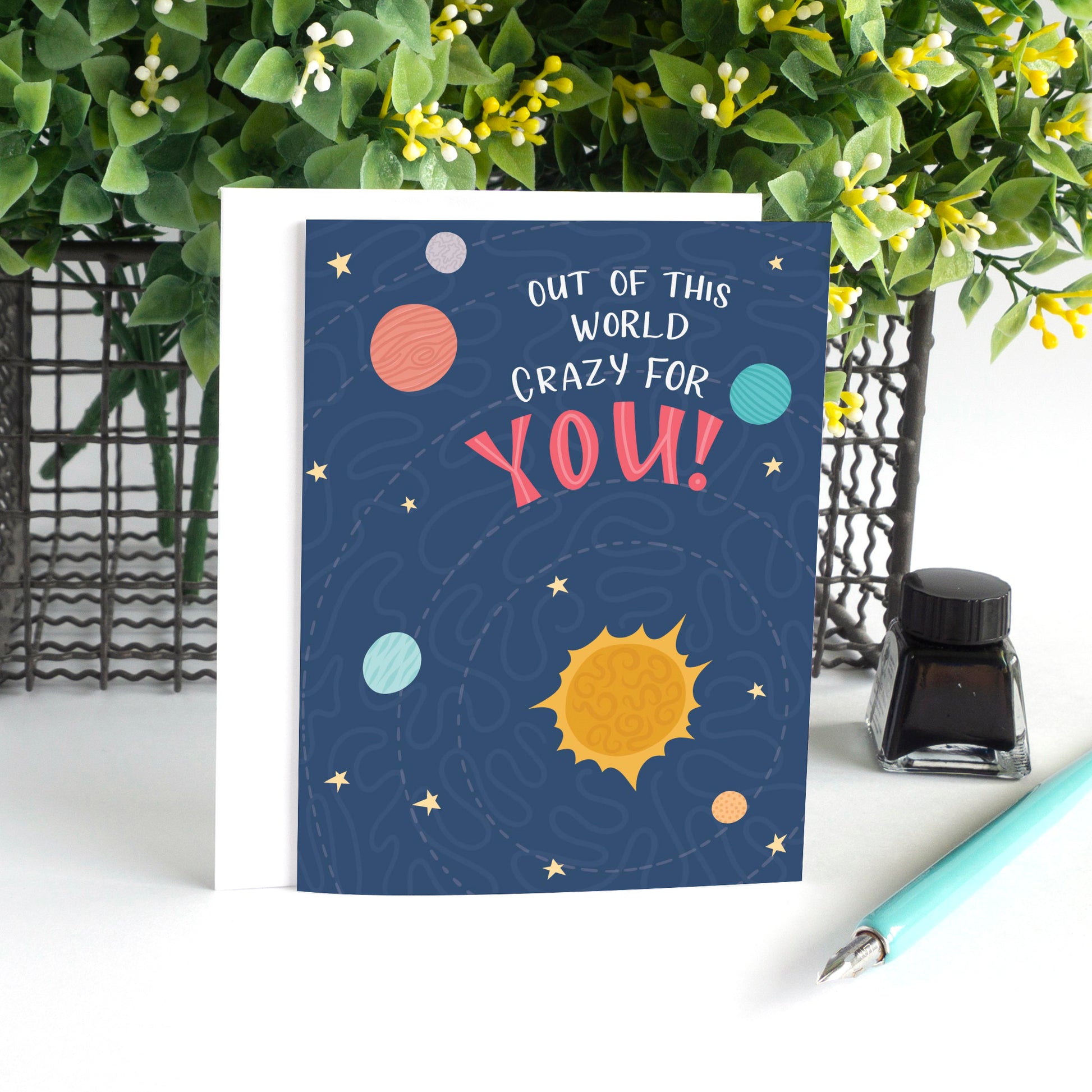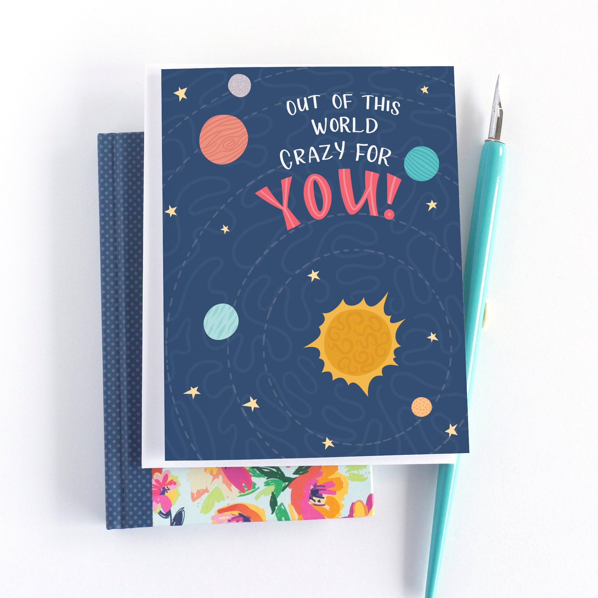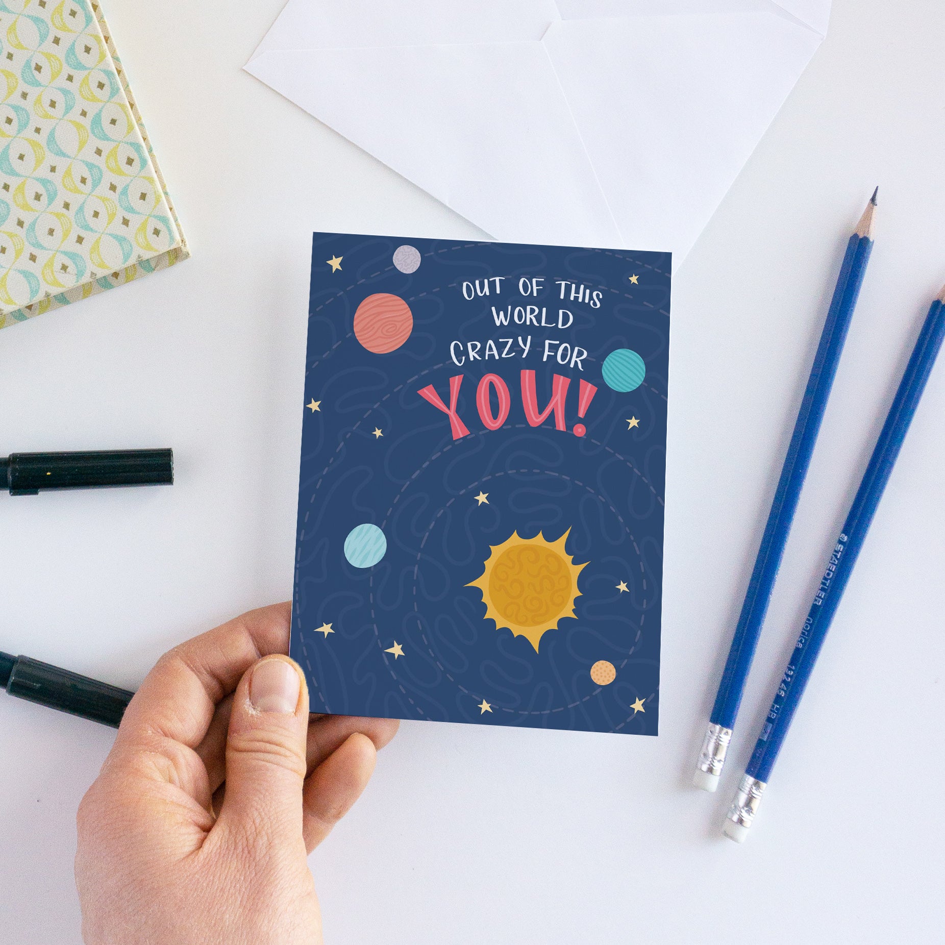 Celebrate your cosmic connection with our Space Love Card! This playful card tells your special someone they're "out of this world" crazy for. The card features a charming illustration of the solar system, making it a stellar choice for Valentine's Day or anniversaries. Express your love in a fun and unique way, reminding your partner that your affection is as vast and infinite as the universe itself. Make your love extraordinary with this cosmic and charming expression of affection!