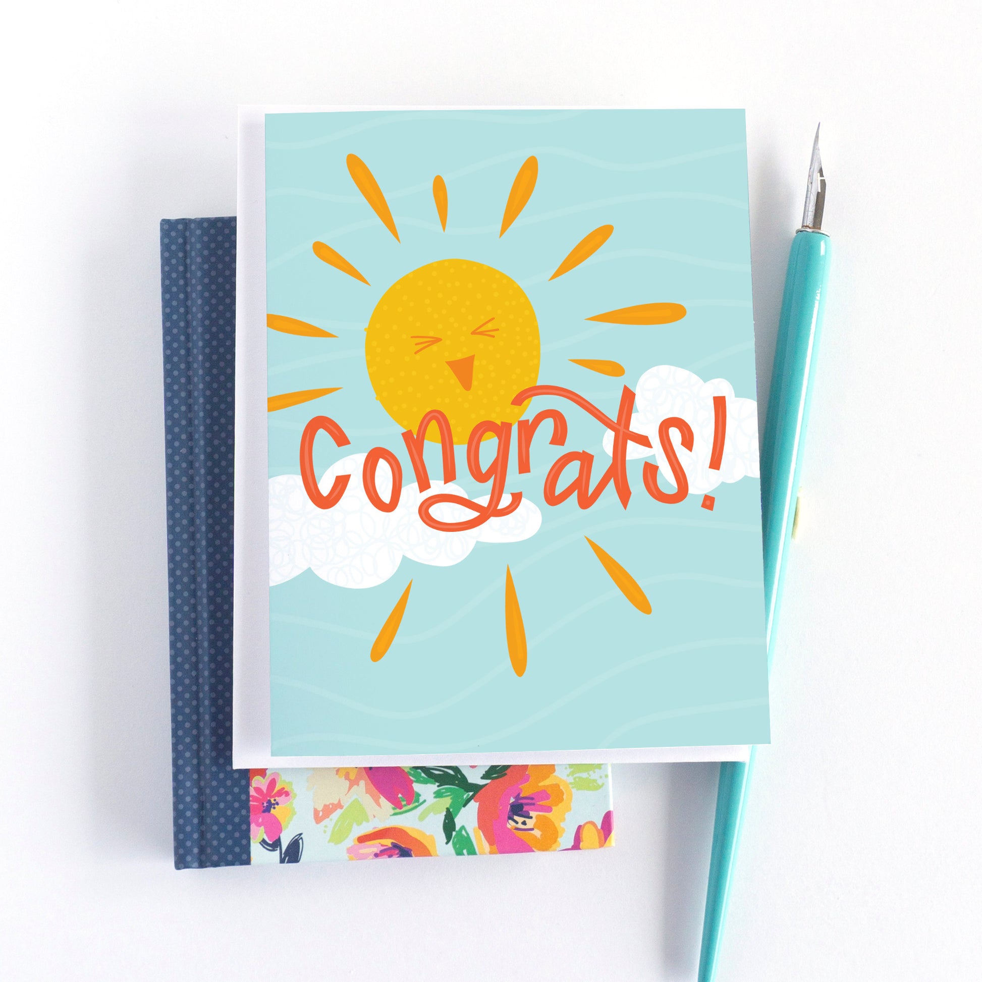 Celebrate with a burst of cheer using our "Congratulations" card! Radiating sunny vibes, it features an illustration of a joyful sun, the perfect way to spread happiness and say "Hooray!" to the recipient. Crafted with care, our card adds a touch of vibrant energy and warmth to your heartfelt congratulations. Whether for achievements big or small, our card captures the sunny spirit of success. Embrace the joy and share the cheerful enthusiasm of their accomplishment with our beautifully crafted card, a bright reminder of the moments that deserve to be celebrated in the most spirited way.
