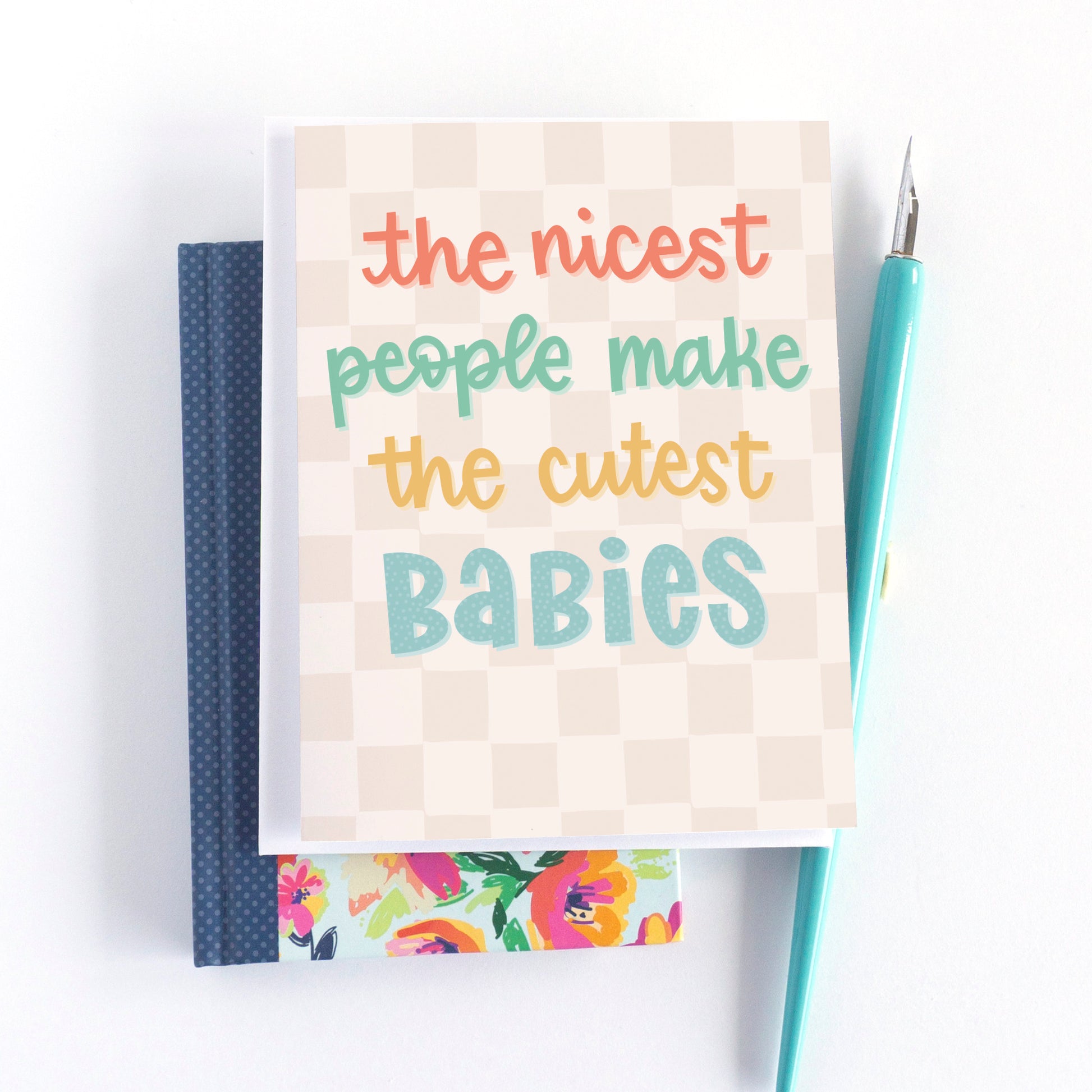 Celebrate the arrival of a little one with this charming hand drawn baby card featuring the text “The nicest people make the cutest babies.” With its soft checkered background and sweet sentiment, it’s the perfect gender neutral card for new parents. Thoughtful and playful, it adds a warm touch to any baby shower gift or newborn celebration — a keepsake they’ll love almost as much as their new bundle of joy.