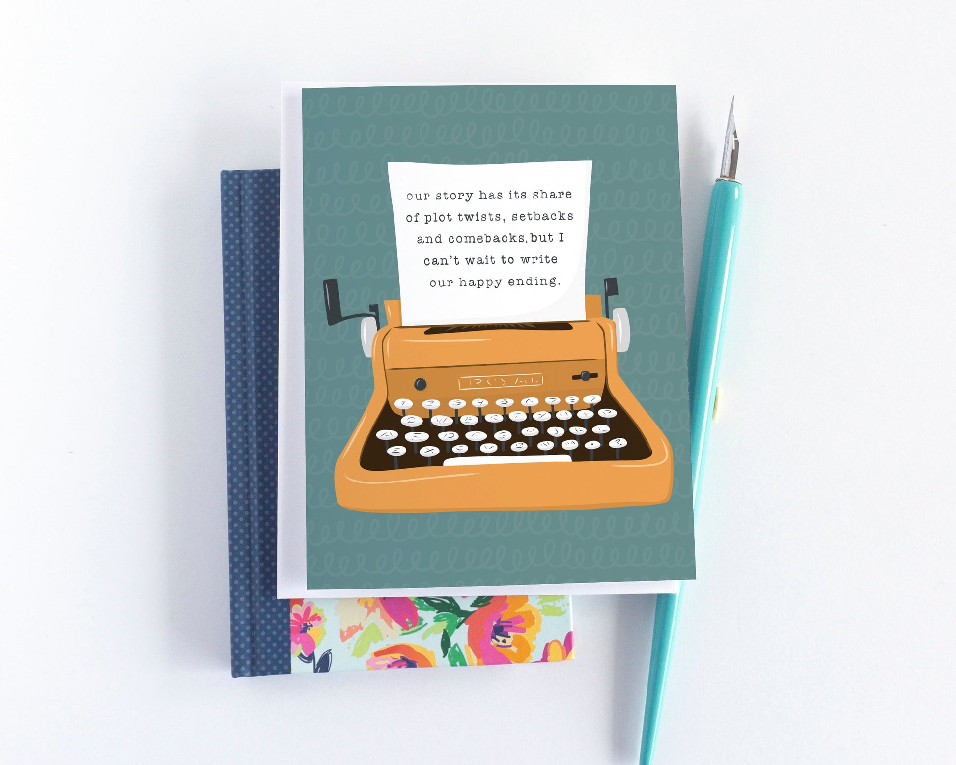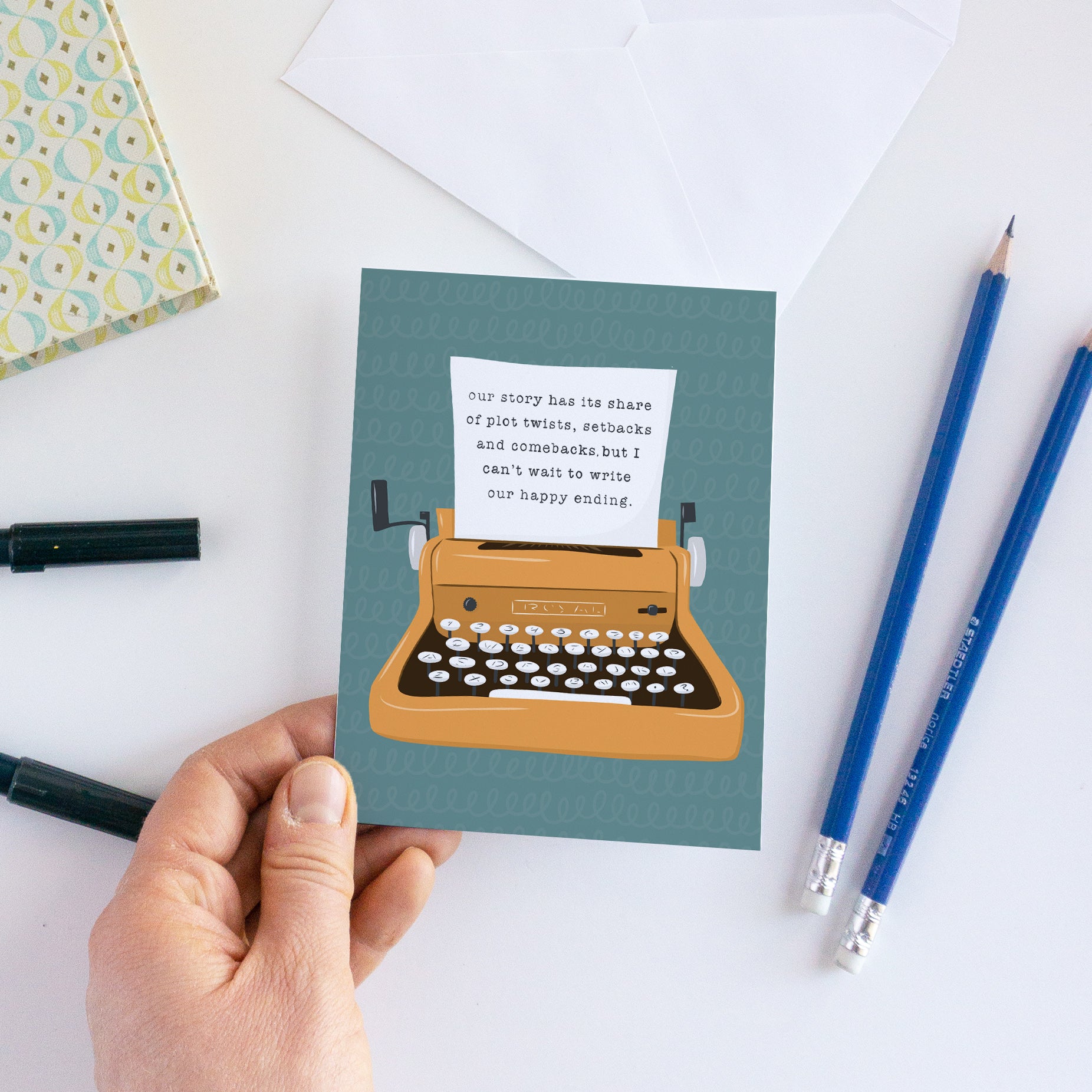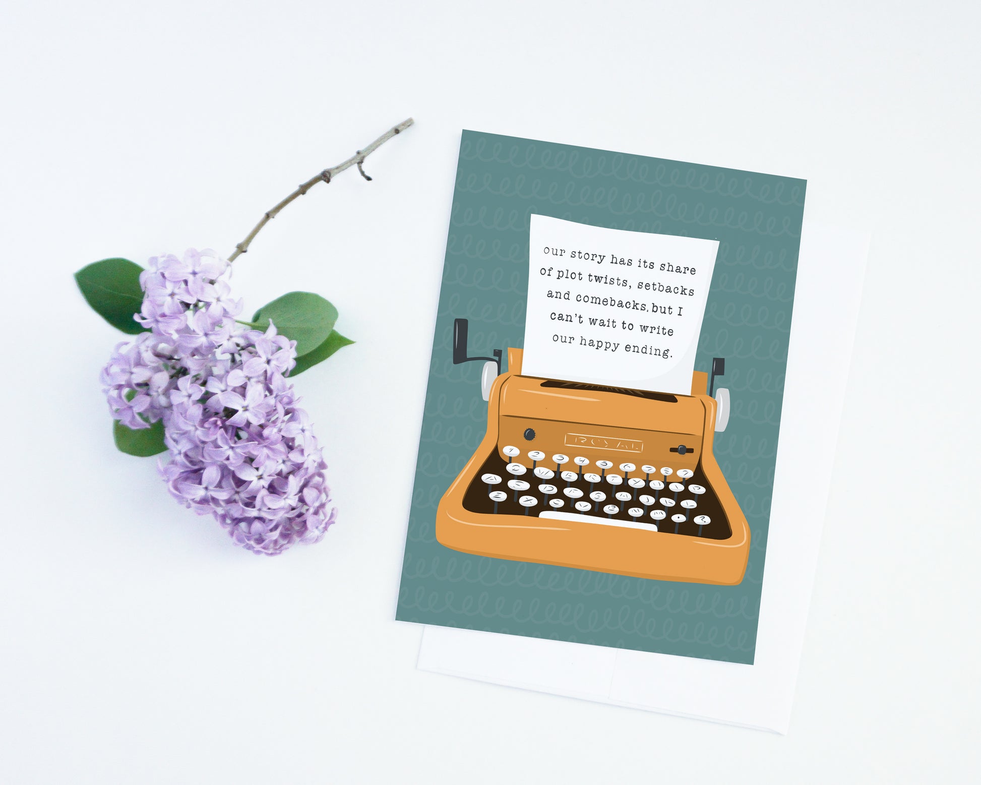 Celebrate your enduring love story with our charming love card, showcasing a vintage typewriter typing out a heartfelt message. This retro-inspired card delivers a sweet and playful pun, letting your partner or spouse know that no matter what life has "typed" your way, your love remains unwavering. It's the perfect choice for Valentine's Day, anniversaries, or any special occasion where you want to express your deep affection. Remind them that your love story is like a well-typed novel - full of twists and turns, but always captivating. With this card, you're eagerly anticipating the next chapter of your shared journey.
